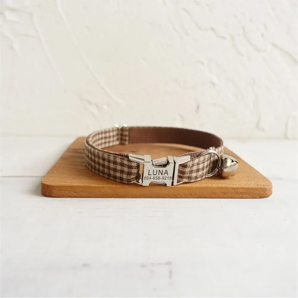 Collar de gato personalizado con campana, placa con nombre personalizada, hebilla de metal de identificación, collares de gato a cuadros de café ajustables con campana