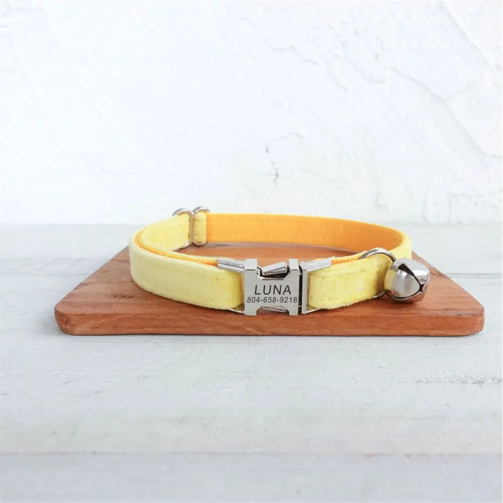Nombre del producto: Collar de gato personalizado, contacto con nombre de identificación personalizado, hebilla de metal, collares de gato de terciopelo amarillo ajustables con campana