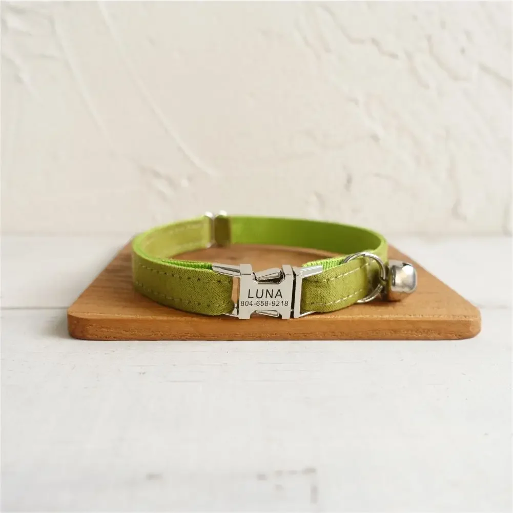 Nombre del producto: Collar de gato personalizado, contacto con nombre de identificación personalizado, hebilla de metal, collares de gato de terciopelo verde claro ajustables con campana