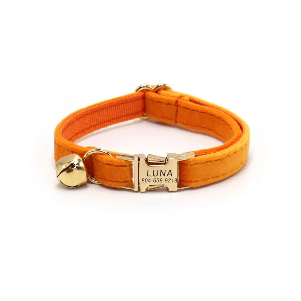 Nombre del producto: Collar de gato personalizado, contacto con nombre de identificación personalizado, hebilla de metal, collares de gato de terciopelo naranja ajustables con campana