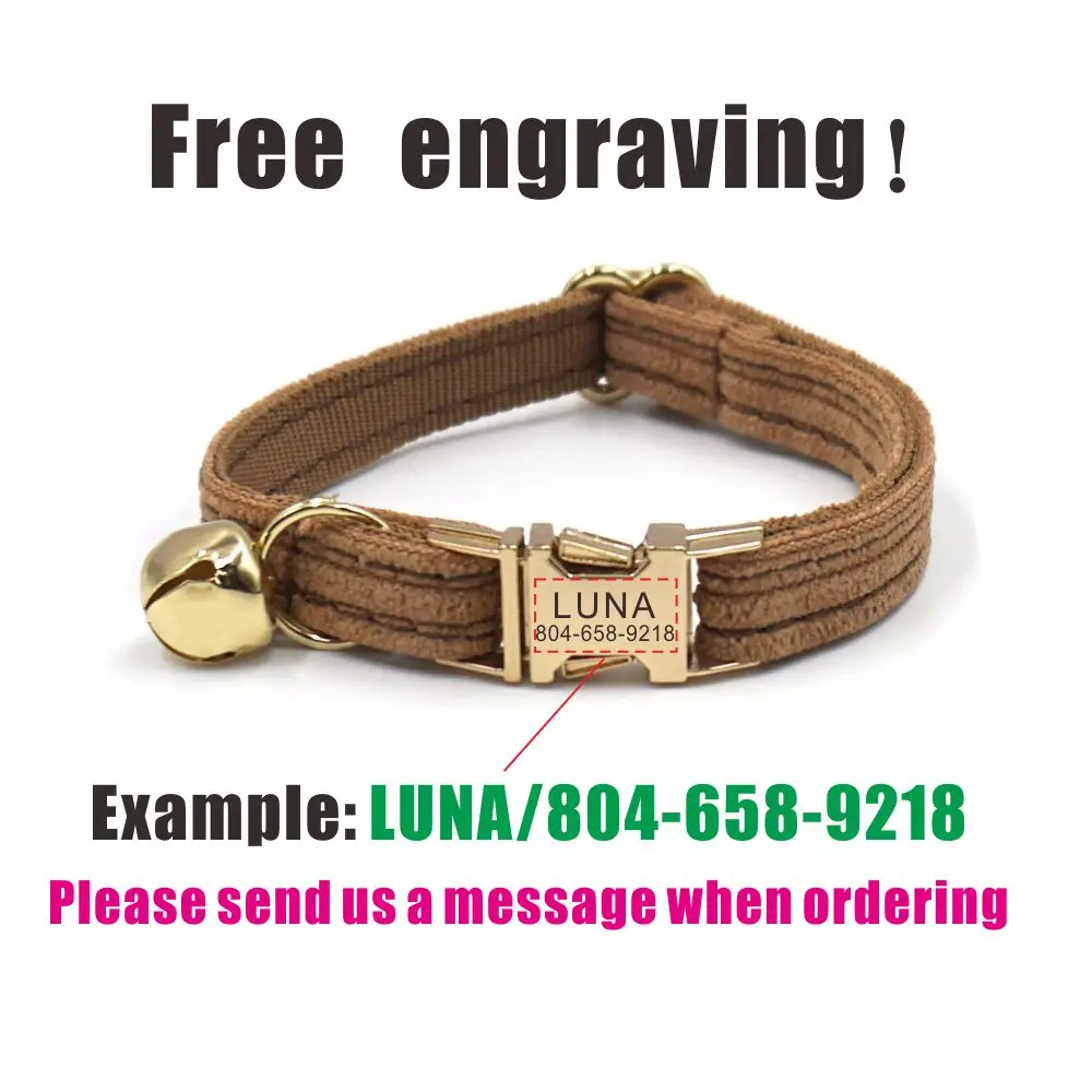 Nombre del producto: Collar de gato personalizado, contacto con nombre de identificación personalizado, hebilla de metal, collares de gato de pana marrón ajustables con campana