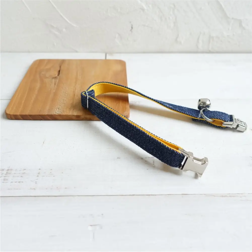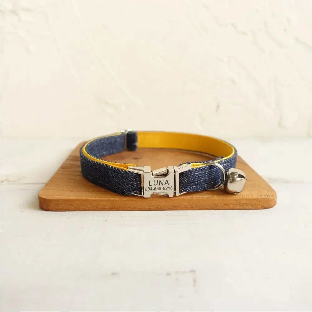 Nombre del producto: Collar de gato personalizado, contacto con nombre de identificación personalizado, hebilla de metal, collares de gato de fibra de mezclilla amarillos ajustables con campana