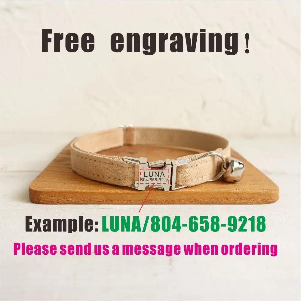 Personalized Cat Collar, Customized ID Name Contacts Metal Buckle, Adjustable Nude Velvet Cat Collars with Bell