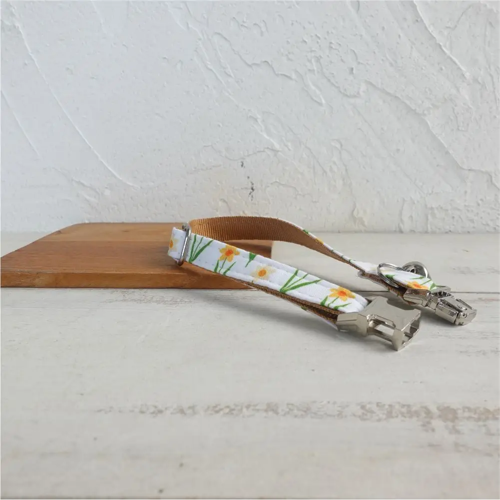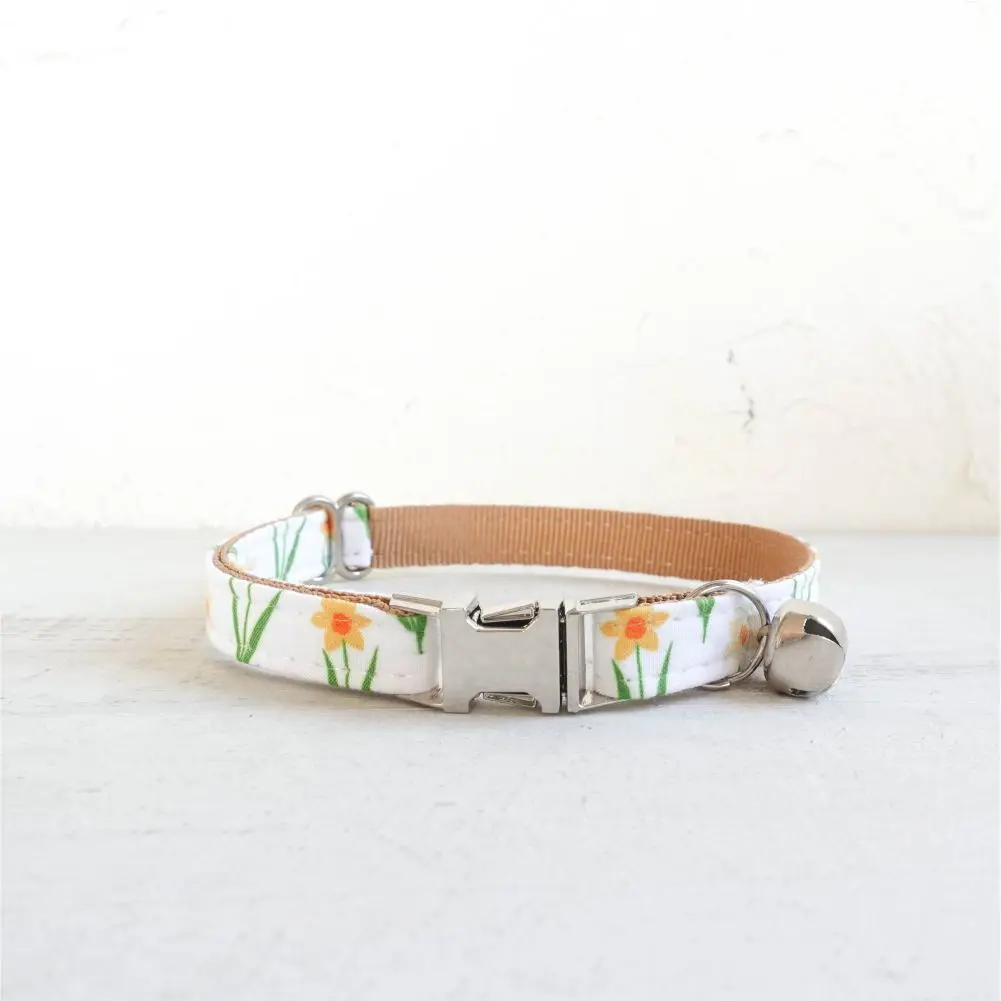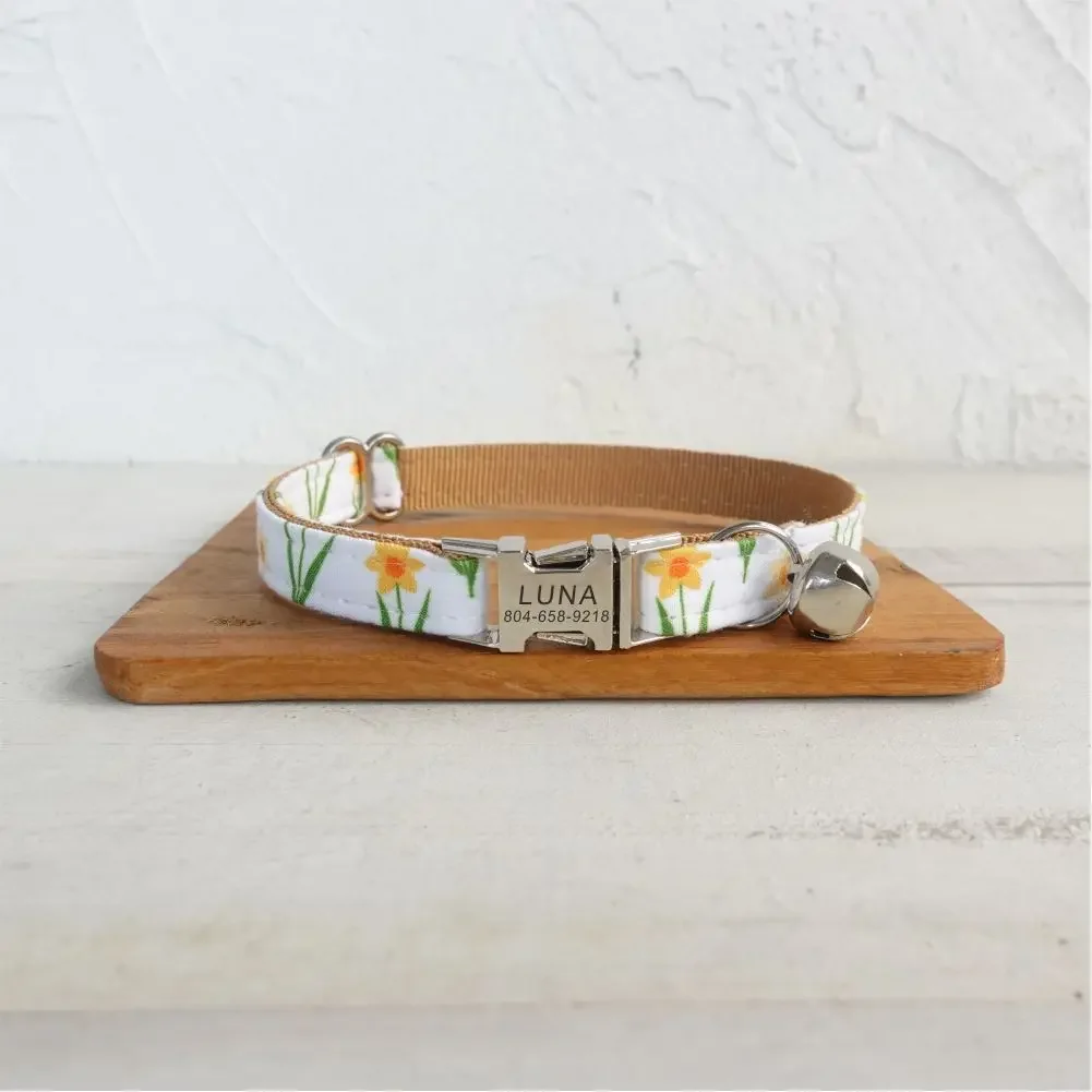 Nombre del producto: Collar de gato personalizado, contacto con nombre de identificación personalizado, hebilla de metal, collares de gato con margaritas de girasol ajustables con campana