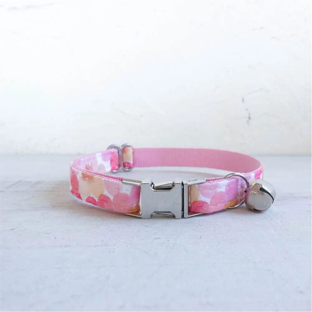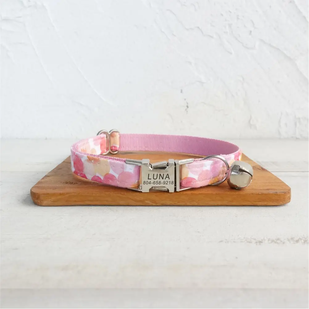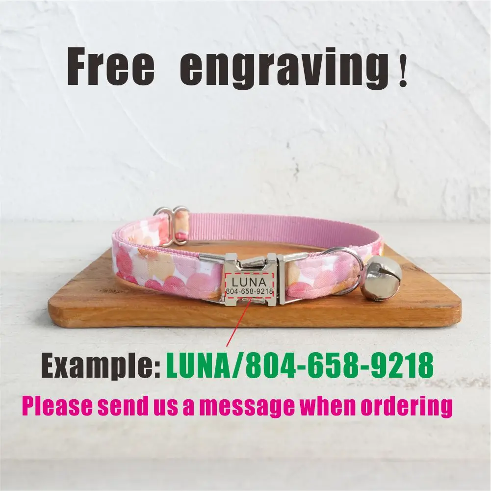 Nombre del producto: Collar de gato personalizado, contacto con nombre de identificación personalizado, hebilla de metal, collares de gato de burbujas rosas ajustables con campana