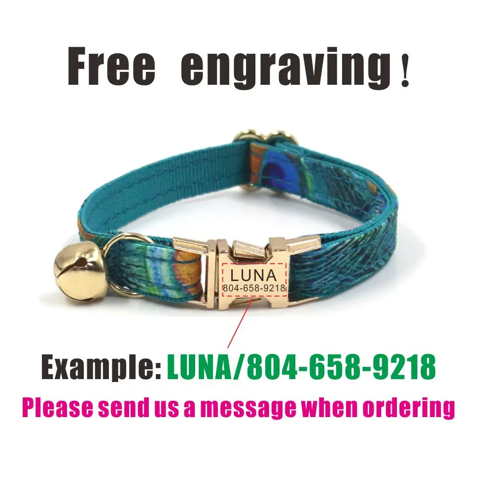 Nombre del producto: Collar de gato personalizado, contacto con nombre de identificación personalizado, hebilla de metal, collares de gato con plumas de pavo real ajustables con campana