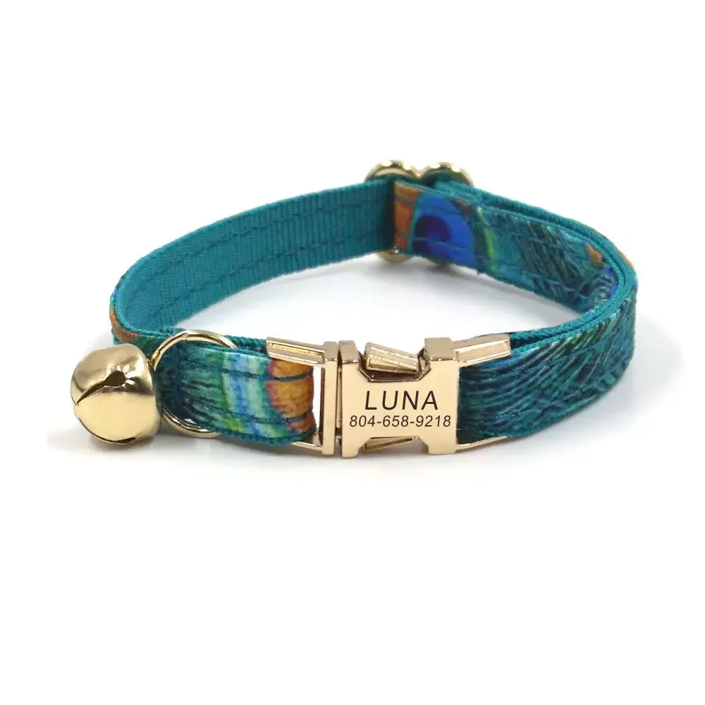 Nombre del producto: Collar de gato personalizado, contacto con nombre de identificación personalizado, hebilla de metal, collares de gato con plumas de pavo real ajustables con campana