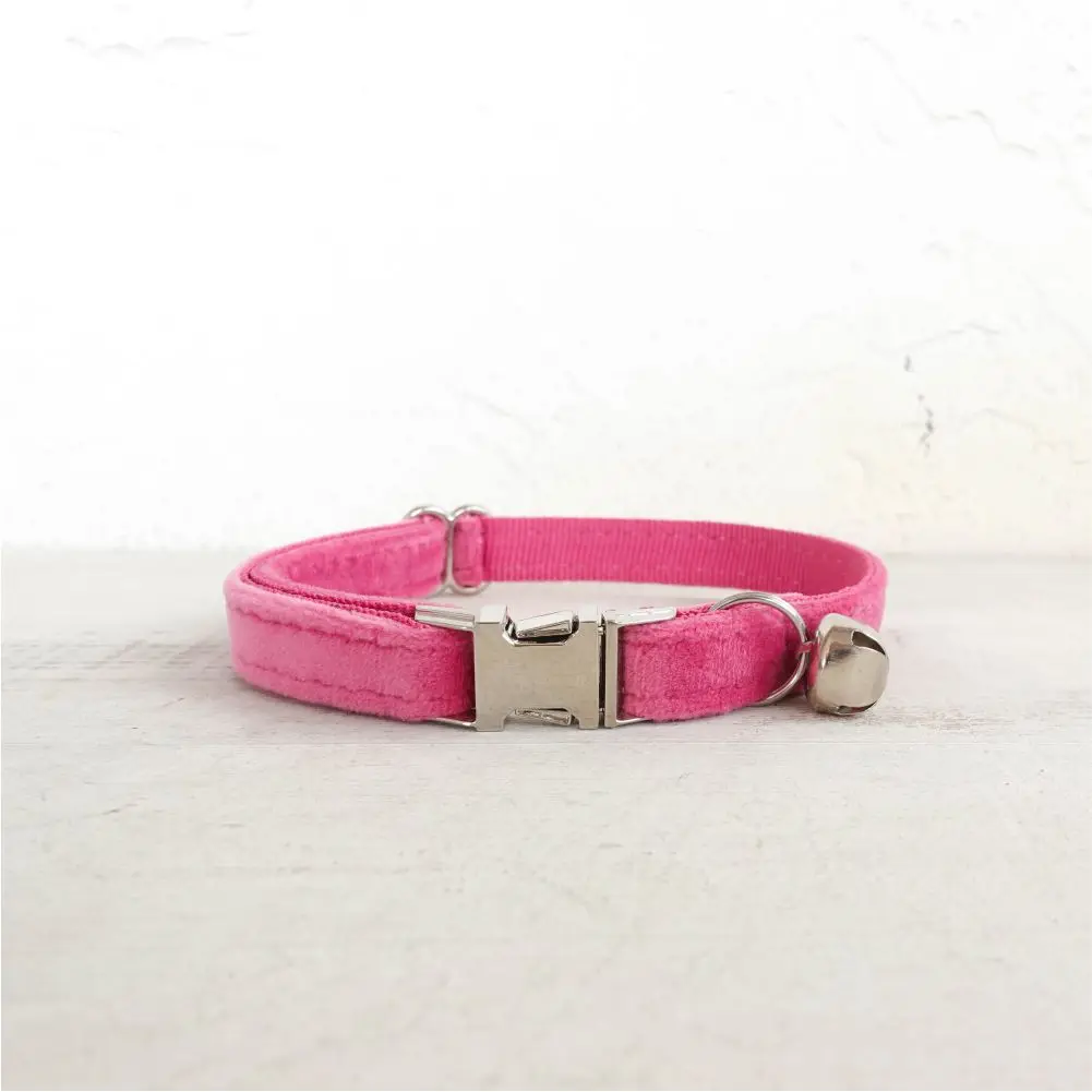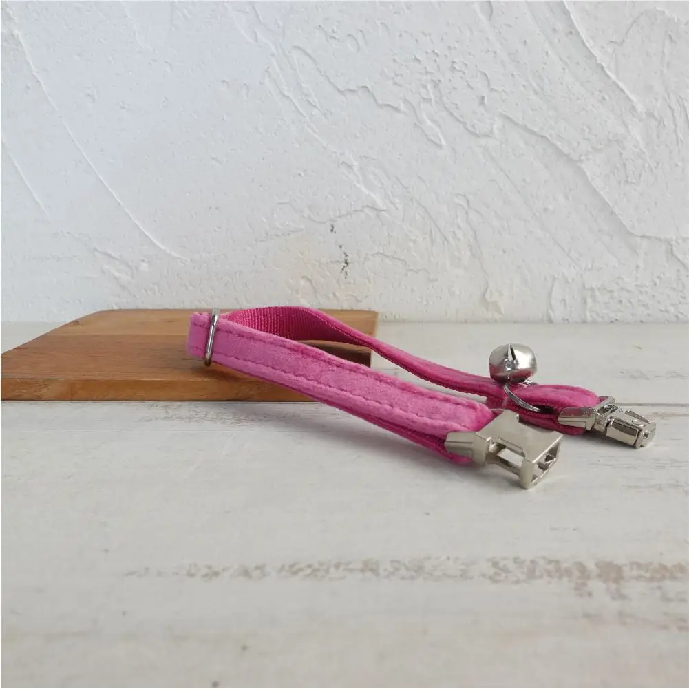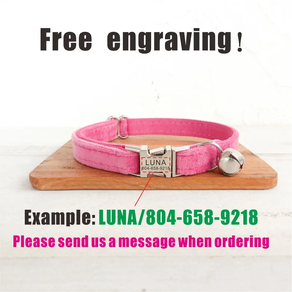 Nombre del producto: Collar de gato personalizado, contacto con nombre de identificación personalizado, hebilla de metal, collares de gato de terciopelo grueso rosa ajustables con campana