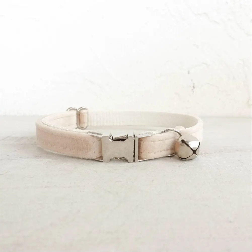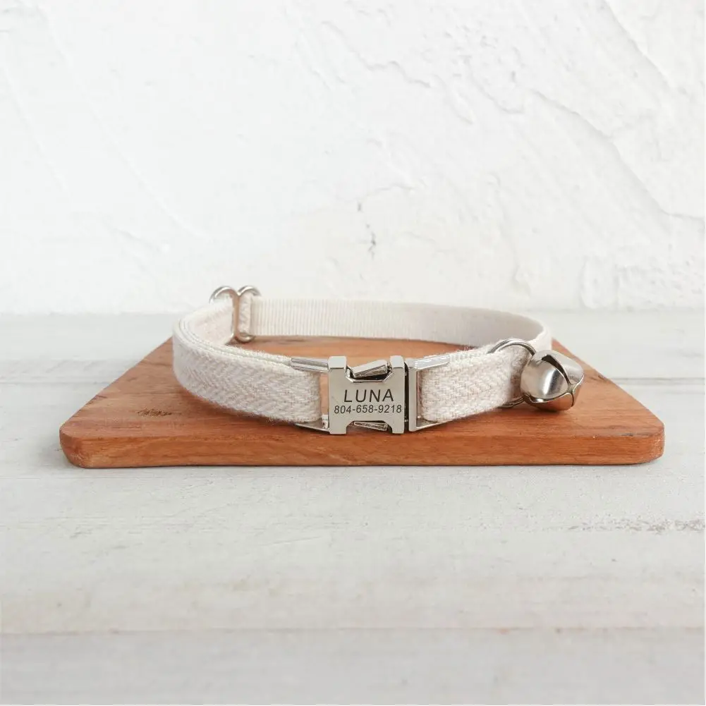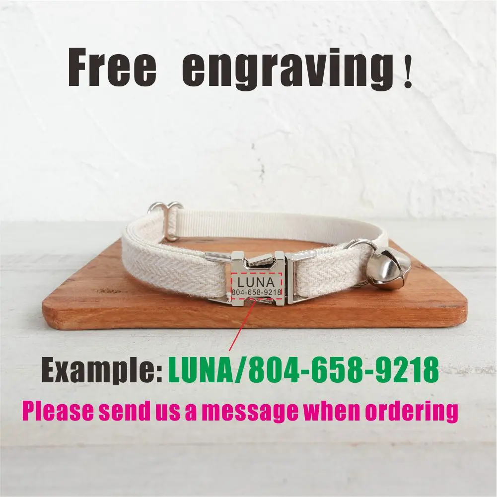 Nombre del producto: Collar de gato personalizado, contacto con nombre de identificación personalizado, hebilla de metal, collares de gato de fibra de traje grueso blanco ajustable con campana