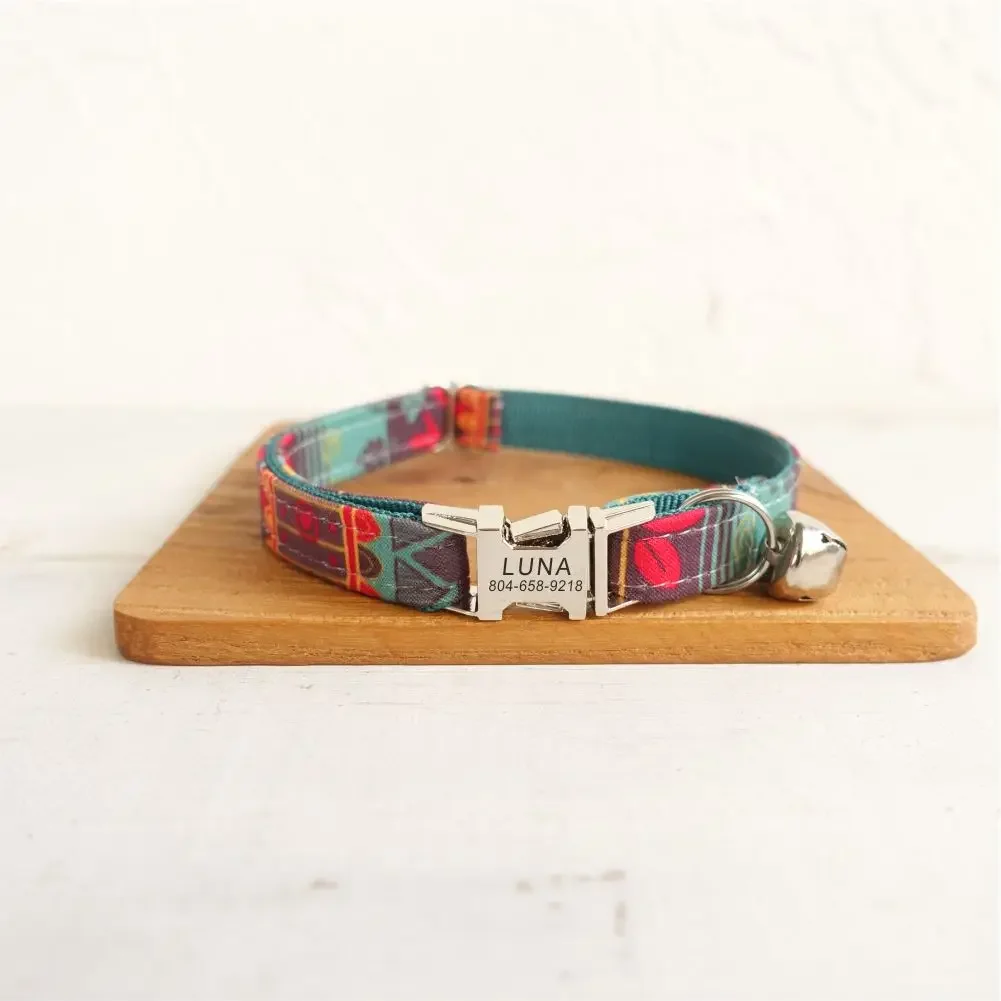 Nombre del producto: Collar de gato personalizado, contacto con nombre de identificación personalizado, hebilla de metal, collares de gato estilo Maya ajustables con campana