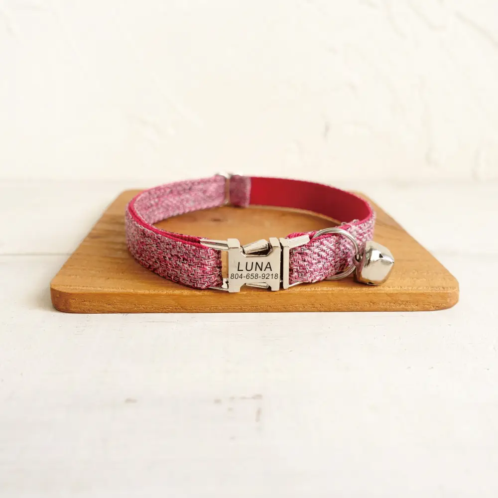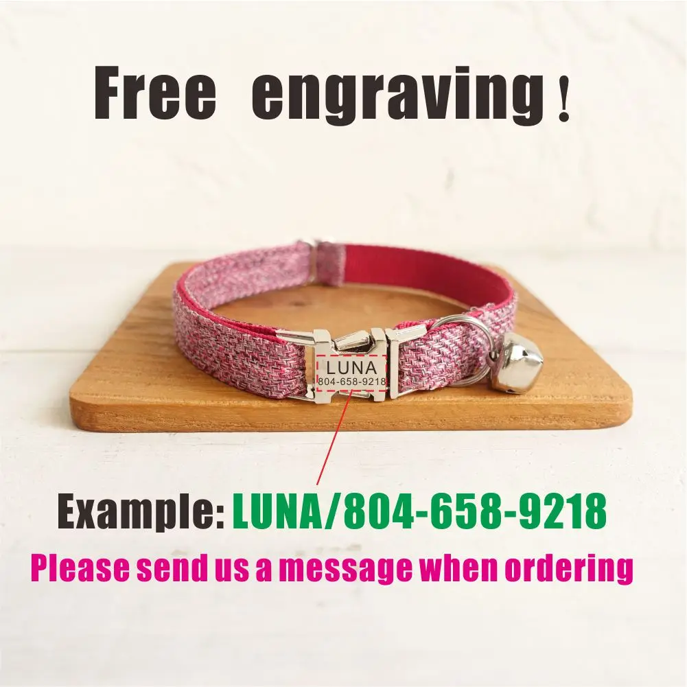Nombre del producto: Collar de gato personalizado con grabado gratuito, correa para mascotas a juego, hebilla de metal con contactos personalizados, collar para mascotas de fibra de traje rosa