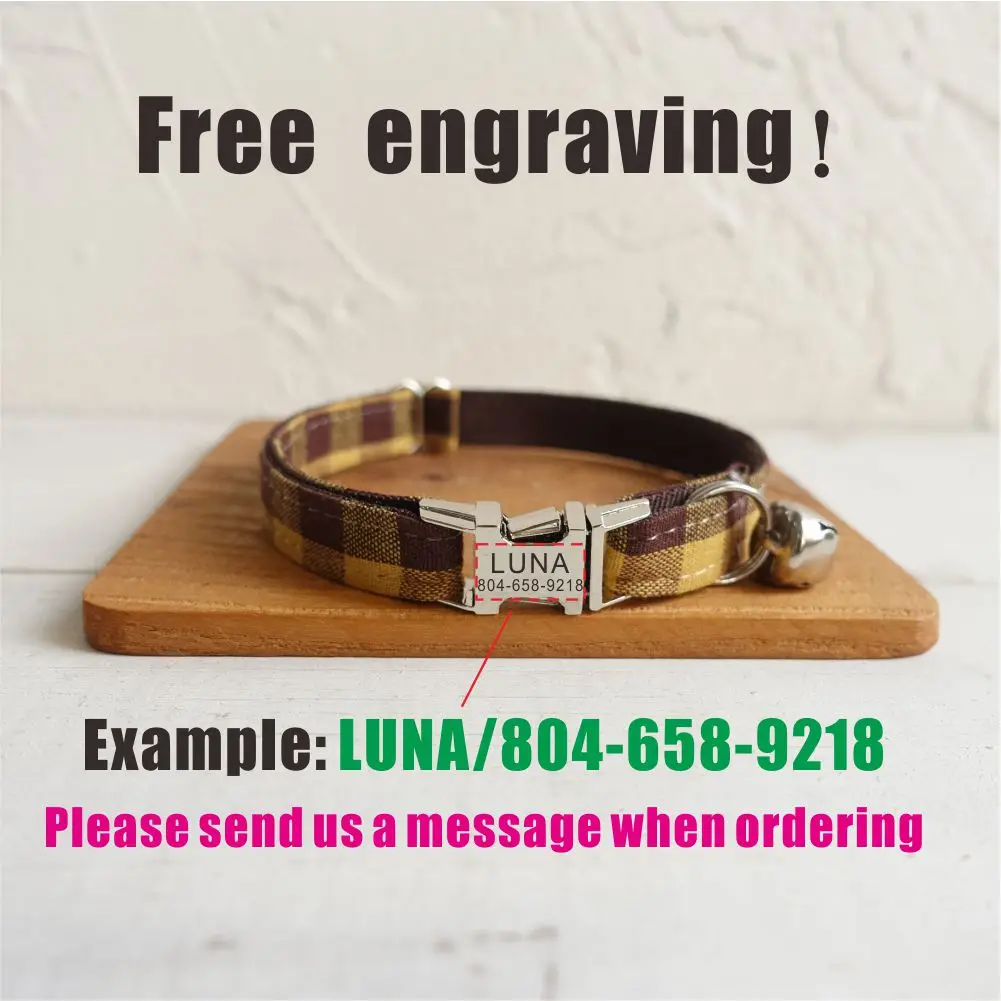 Nombre del producto: Collar de gato personalizado con grabado gratuito, correa para mascotas a juego, hebilla de metal con contactos personalizados, collar para mascotas a cuadros de color amarillo marrón