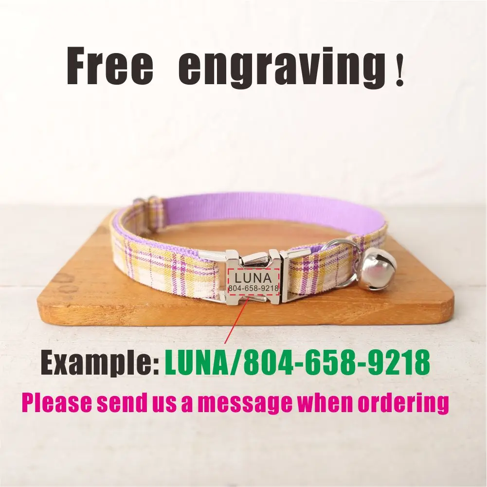 Nombre del producto: Collar de gato personalizado con grabado gratuito, correa para mascotas a juego, hebilla de metal con contactos personalizados, collar para mascotas a cuadros