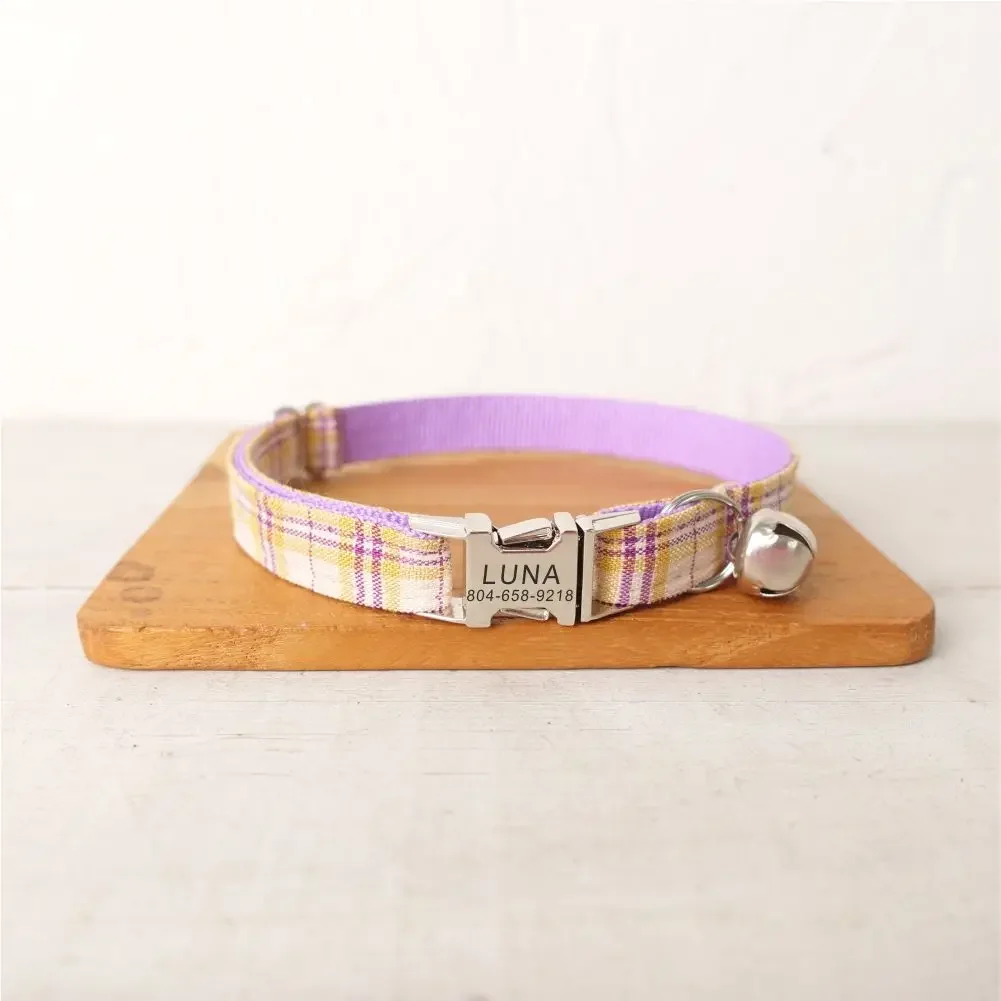 Nombre del producto: Collar de gato personalizado con grabado gratuito, correa para mascotas a juego, hebilla de metal con contactos personalizados, collar para mascotas a cuadros