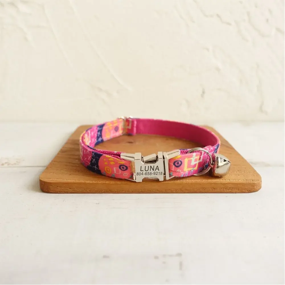 Nombre del producto: Collar de gato personalizado con grabado gratuito, correa para mascotas a juego, hebilla de metal con contactos personalizados, collar para mascotas pequeño con grafiti rosa