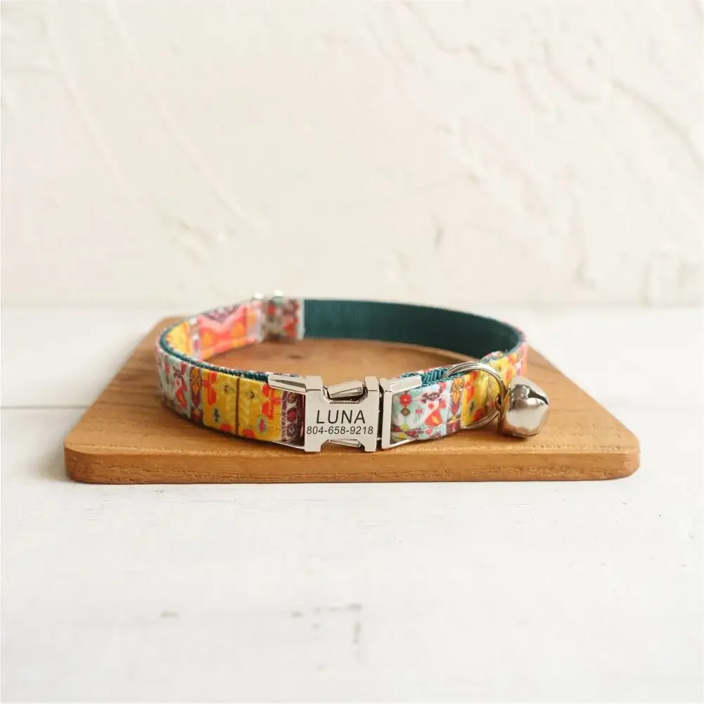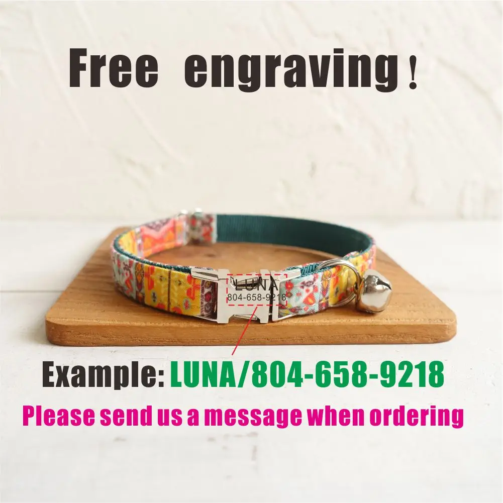 Nombre del producto: Collar de gato personalizado, contacto con nombre de identificación personalizado, hebilla de metal, collares de gato bohemio azul ajustables con campana