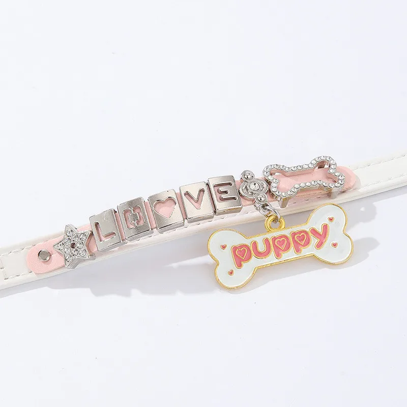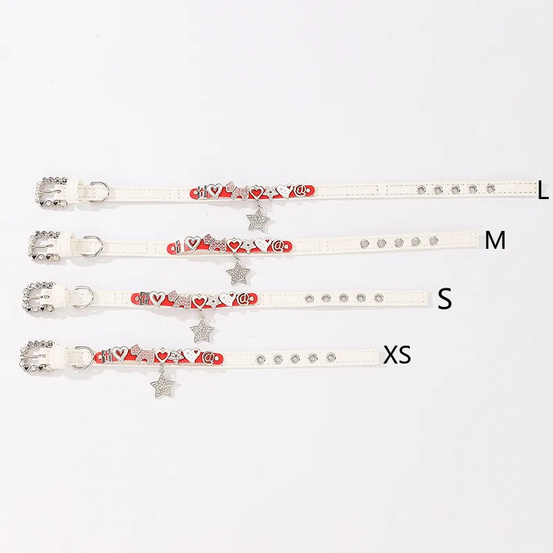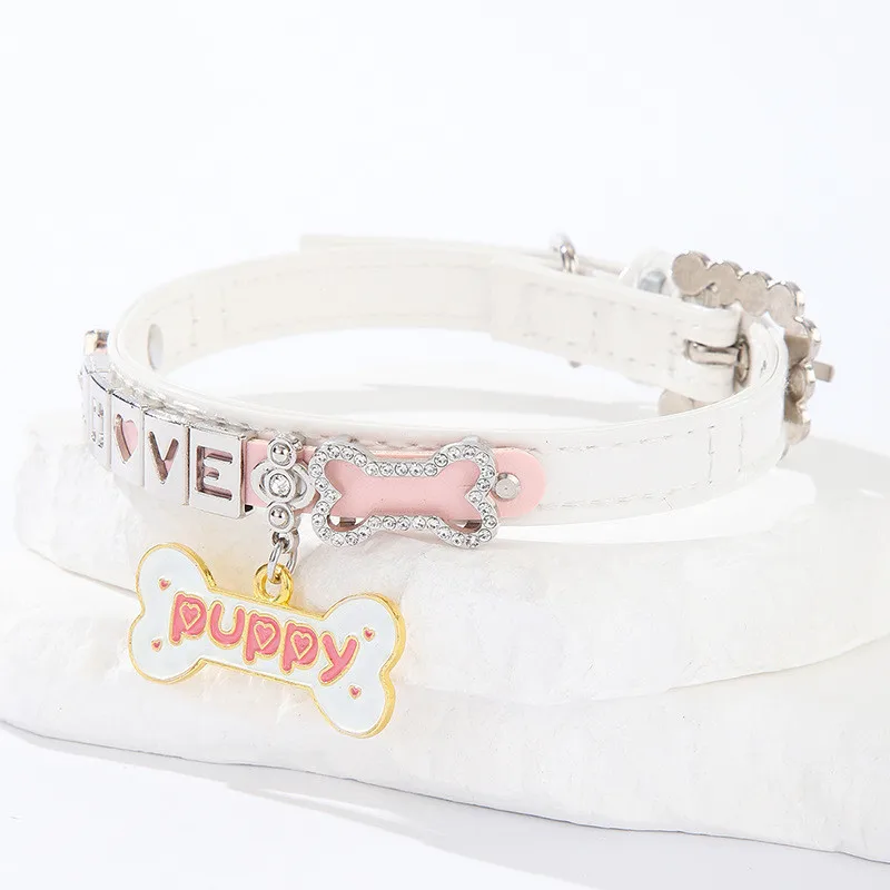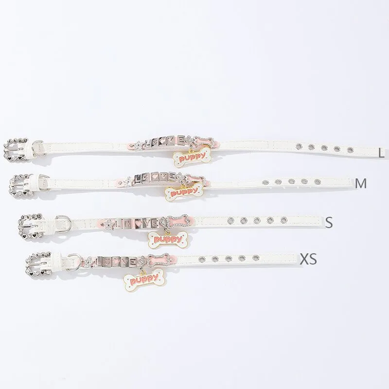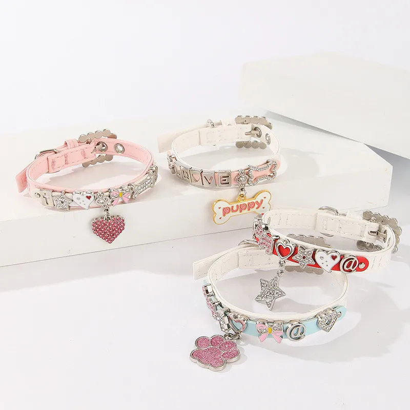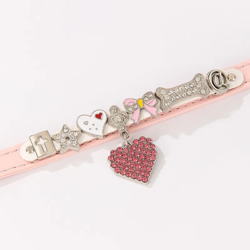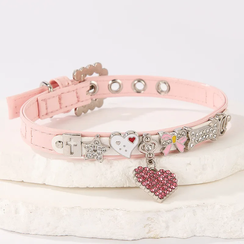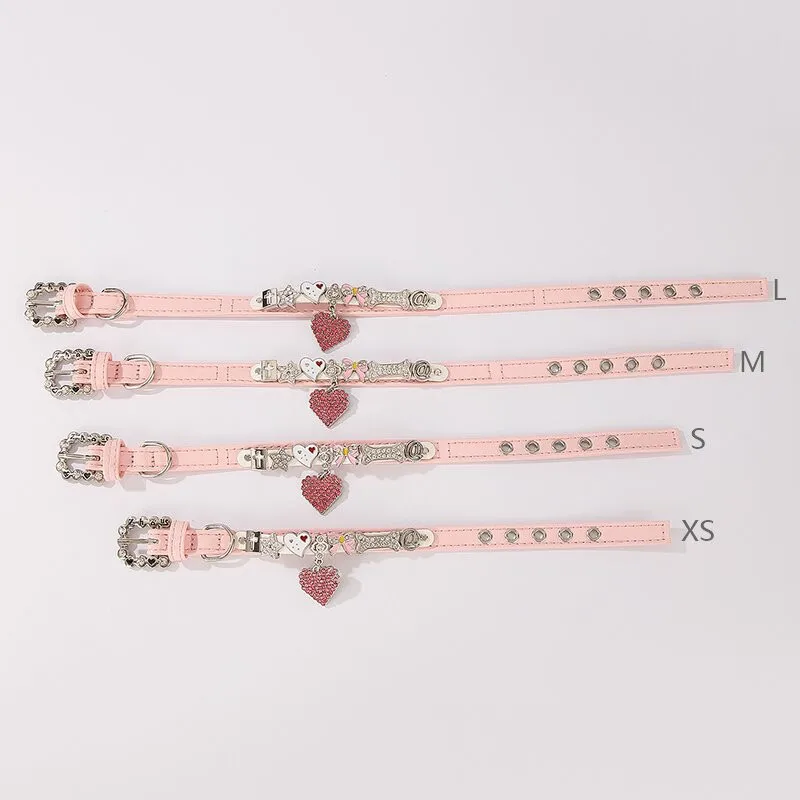 Collar de gato de PU con diamantes de imitación a la moda, Collar de hueso de corazón ostentoso para perro, accesorio de aseo para mascotas con lazo para el cuello de gato