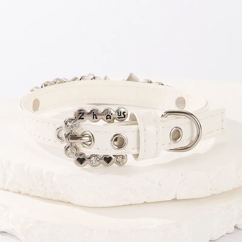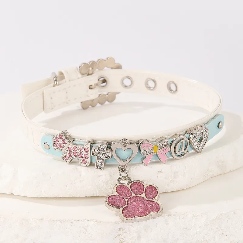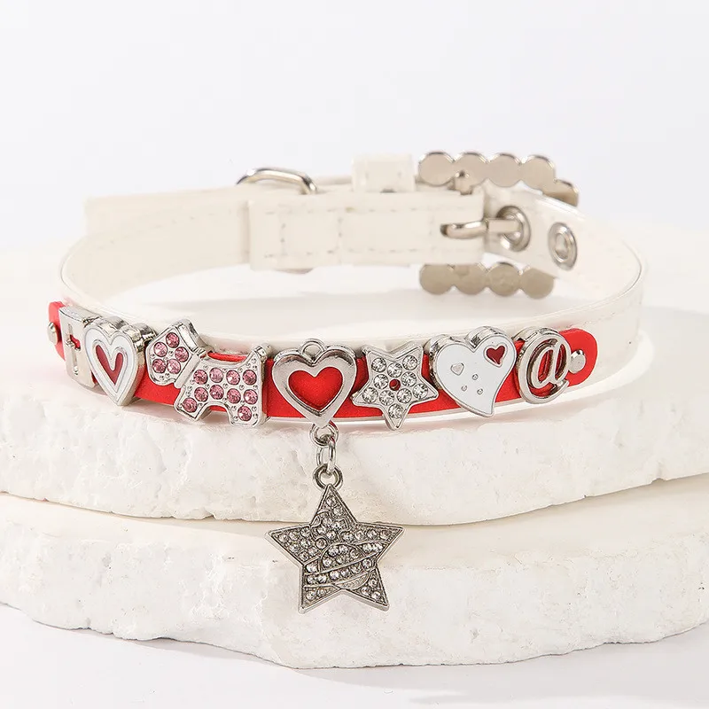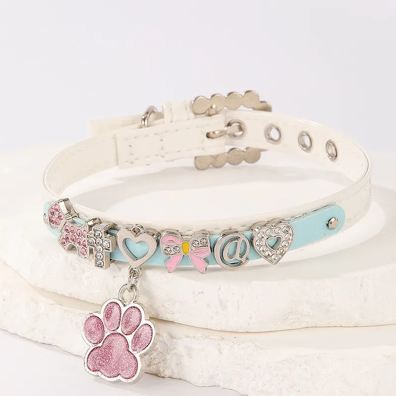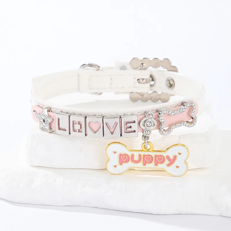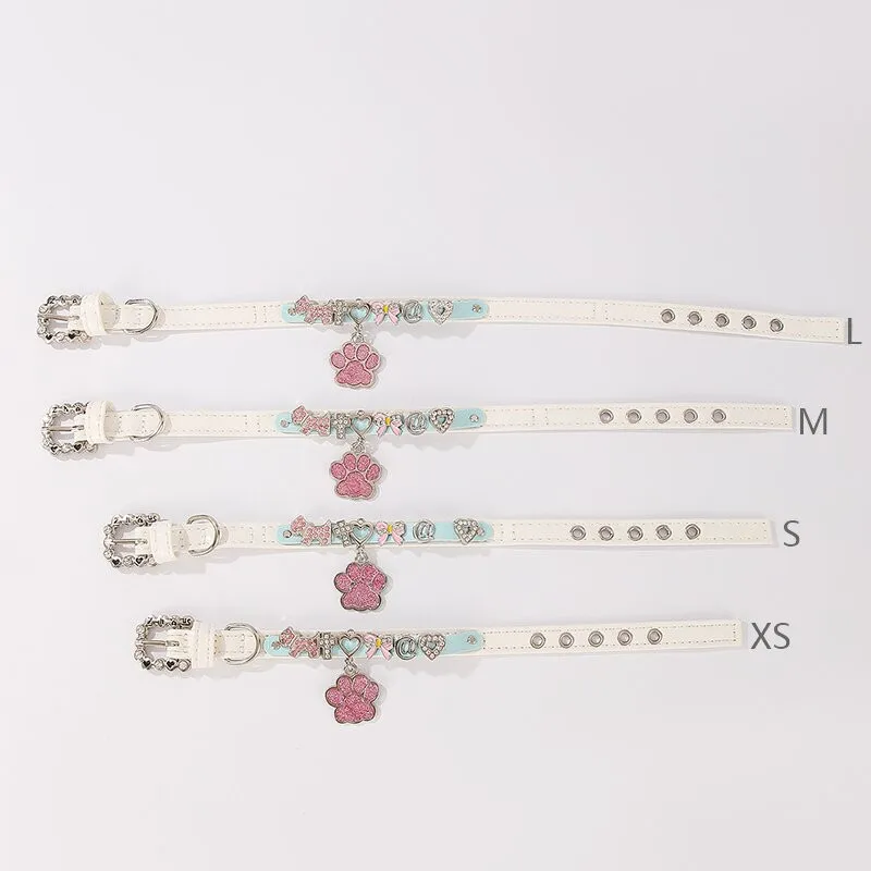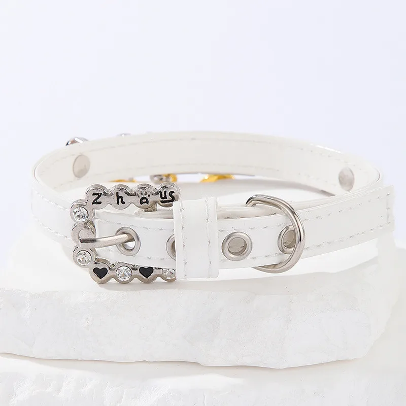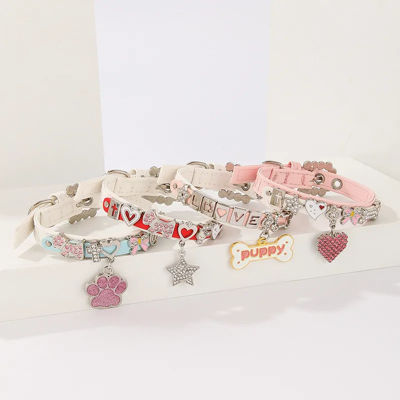 Collar de gato de PU con diamantes de imitación a la moda, Collar de hueso de corazón ostentoso para perro, accesorio de aseo para mascotas con lazo para el cuello de gato