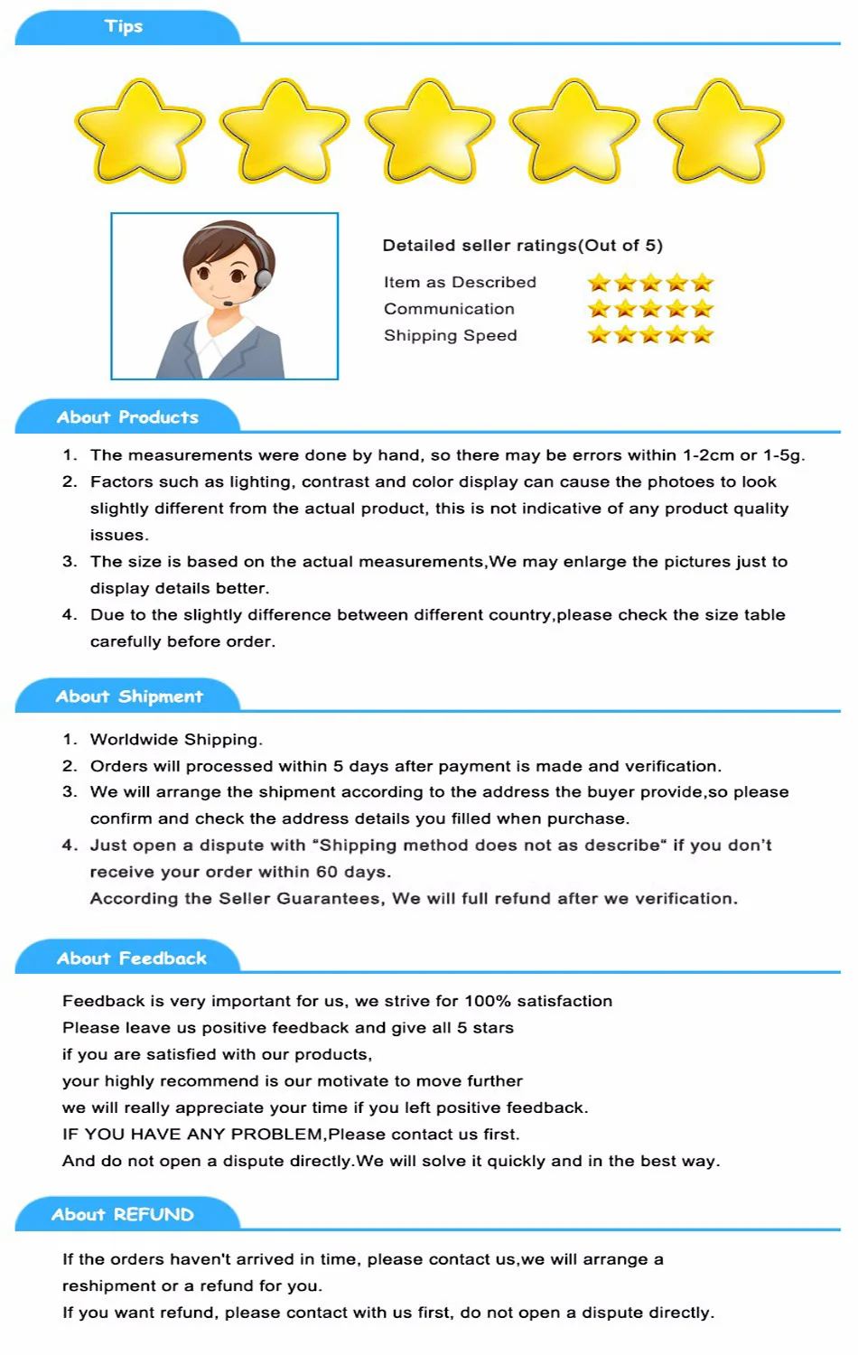 ¡Mantenemos altos estándares de excelencia y nos esforzamos por lograr la satisfacción del cliente al 100%! Los comentarios son muy importantes. Le solicitamos que se comunique con nosotros inmediatamente antes de brindarnos un comentario neutral o negativo para que podamos abordar sus inquietudes de manera satisfactoria.