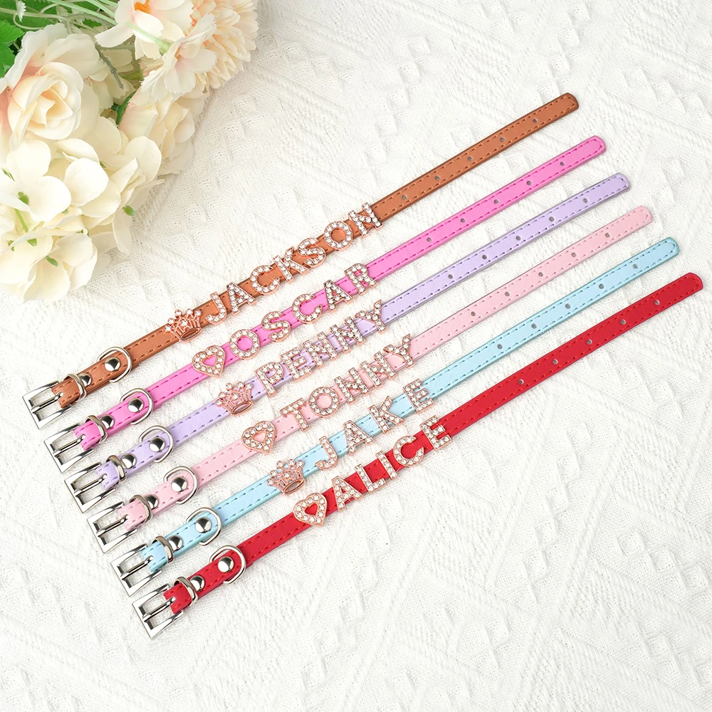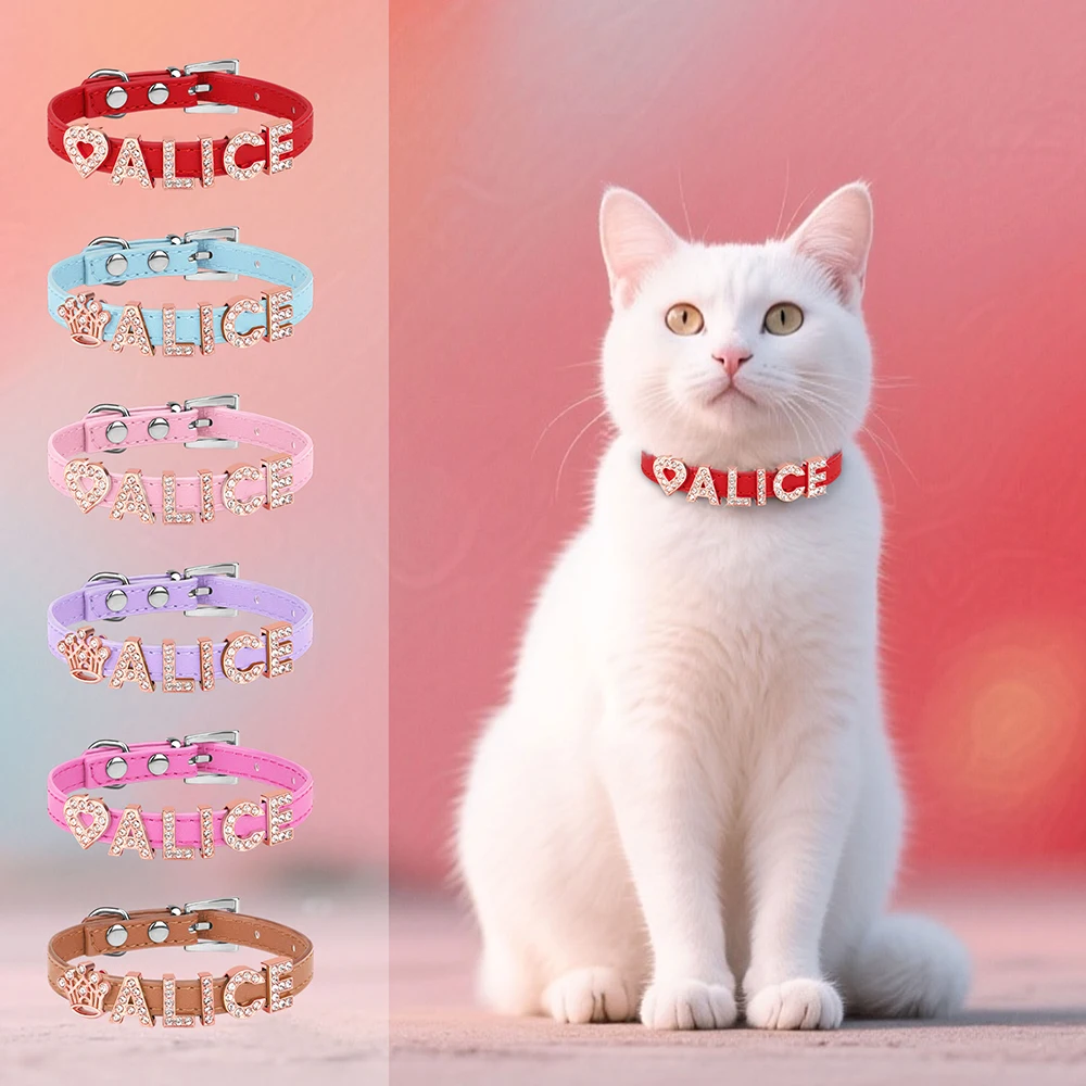 Collar de identificación personalizado para gatos, collares para perros con diamantes de imitación ostentosos, letras con nombre gratis, dijes de corona con pata de corazón, accesorios antipérdida para mascotas, color rosa