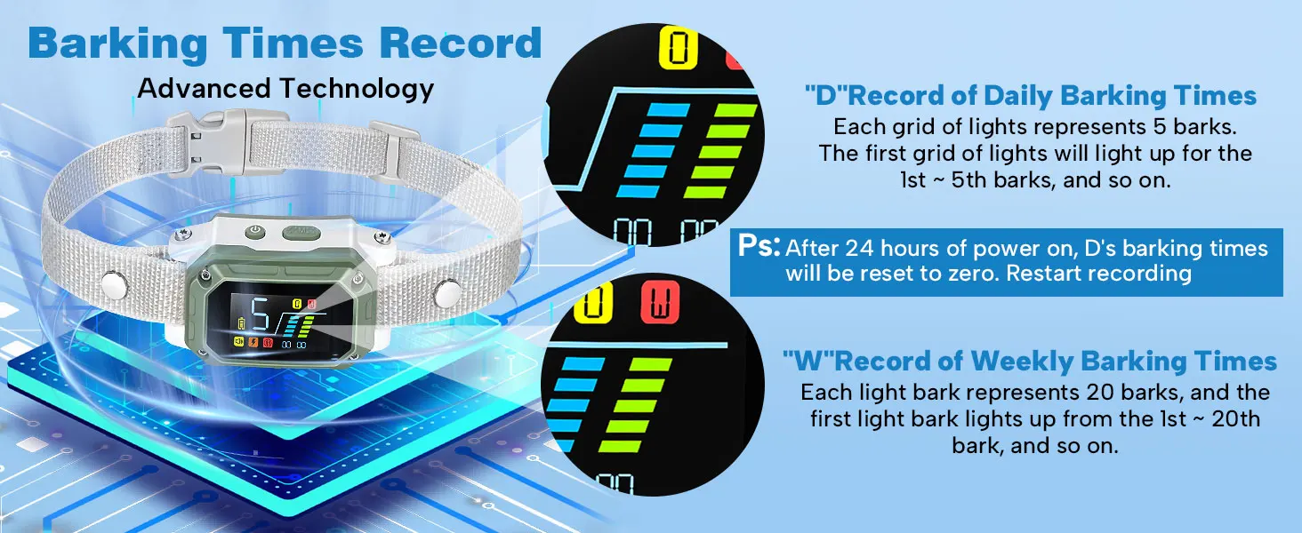 El "D" en la pantalla LED registra el número de latidos dentro de las 24 horas, restableciendo diariamente; "W" muestra registros semanales, ayudando a comprender los hábitos de su perro e implementando medidas de entrenamiento para fomentar un buen comportamiento.