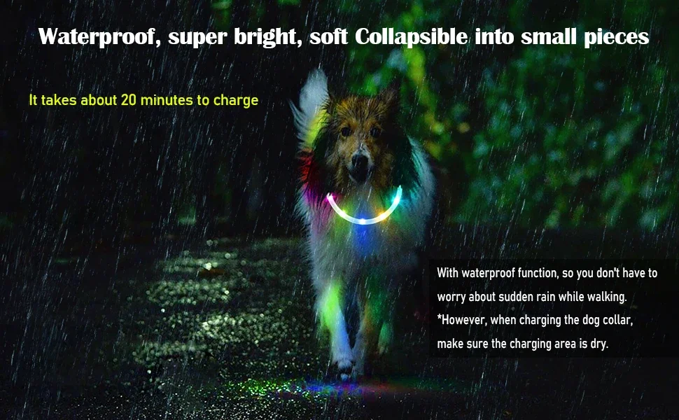 【Impermeable y resistente】El Collar para perros está hecho de tubo de silicona para mantener a su mascota cómoda. Se pliega un poco y es fácil de llevar en la bolsa. Sin manchas durante los inviernos húmedos y fangosos. Fácil de usar, solo tiene que poner el collar y llevar a su perro a pasear a cualquier lugar. Se puede lavar con agua pero no con detergente, y es impermeable, por lo que no tiene que preocuparse por una lluvia repentina durante su paseo. Pero al cargar el collar de su perro, asegúrese de que el puerto de carga esté seco.