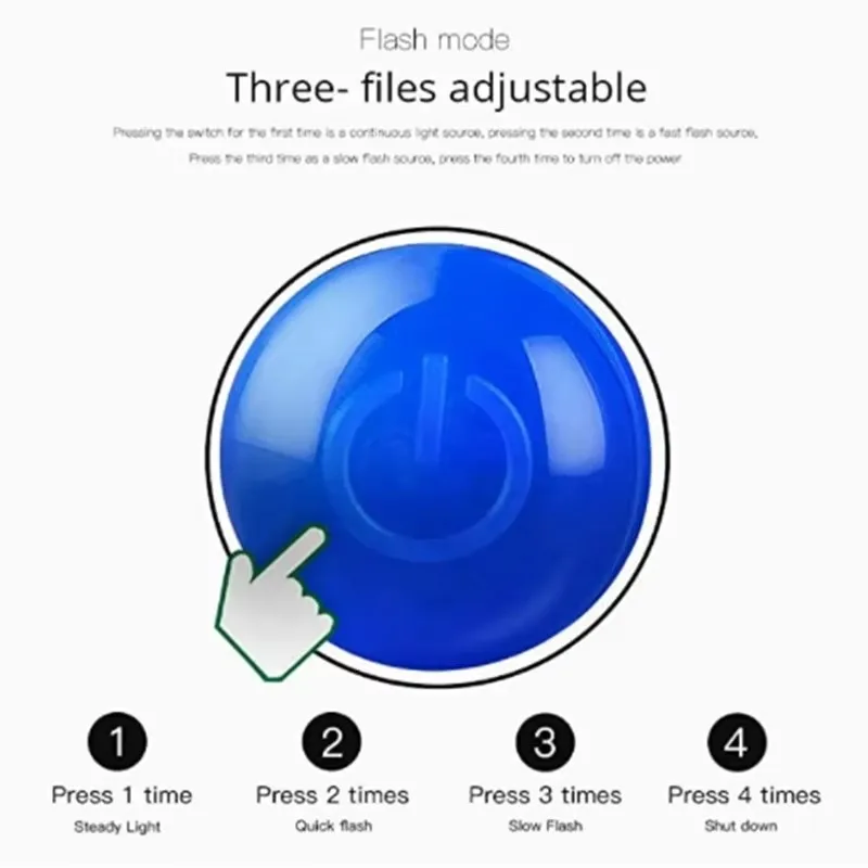 Instrucciones de uso: Presionar una vez es una fuente de luz continua y presionar dos veces es una fuente de luz intermitente.