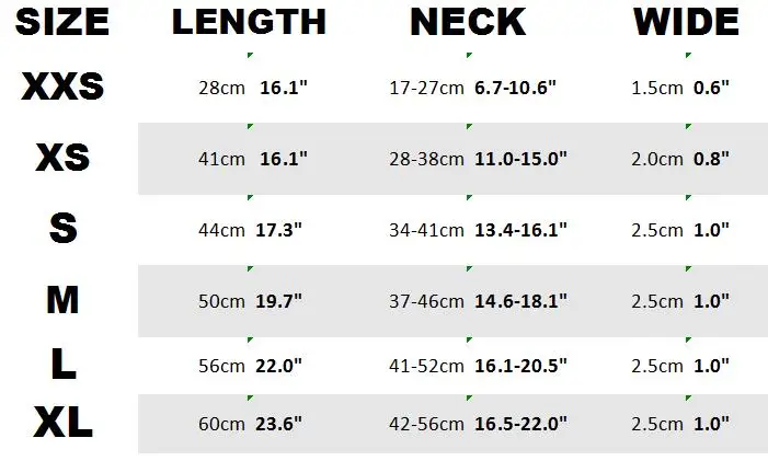 XXS:ancho 1,5 cm, adecuado para circunferencia del cuello de 17-27 cm/6,7-10,6 pulgadas, longitud total 30 cm