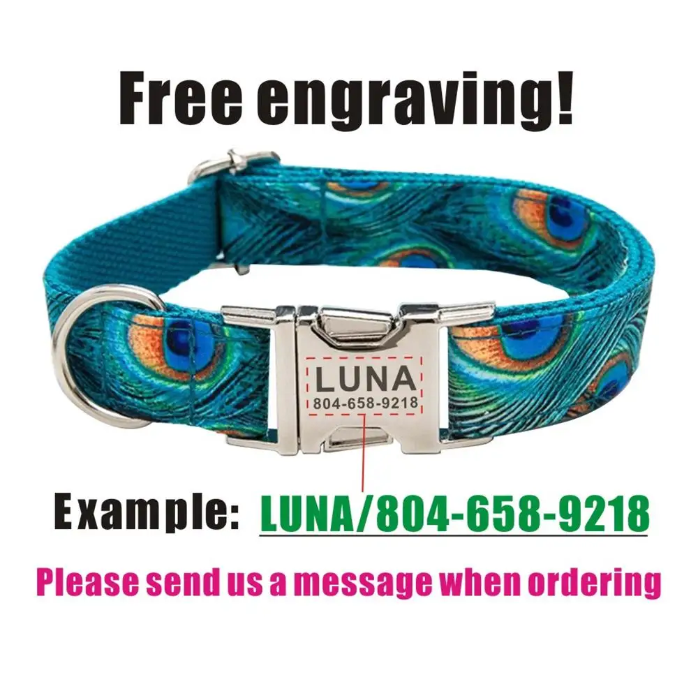 Nombre del producto: Collar personalizado para mascotas, grabado gratuito, placa con nombre personalizada para cachorros, etiqueta de identificación, collares básicos de plumas de pavo real ajustables, juego de correa de plomo