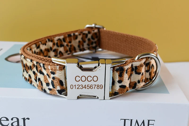 Collar de perro con lazo con estampado de leopardo para perros pequeños, medianos y grandes, collares personalizados, placa de identificación grabada, suministros para mascotas, Collar personalizado Animal 01