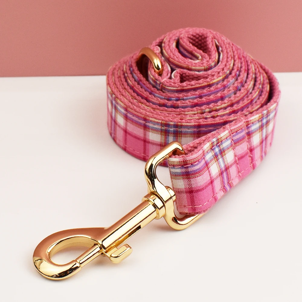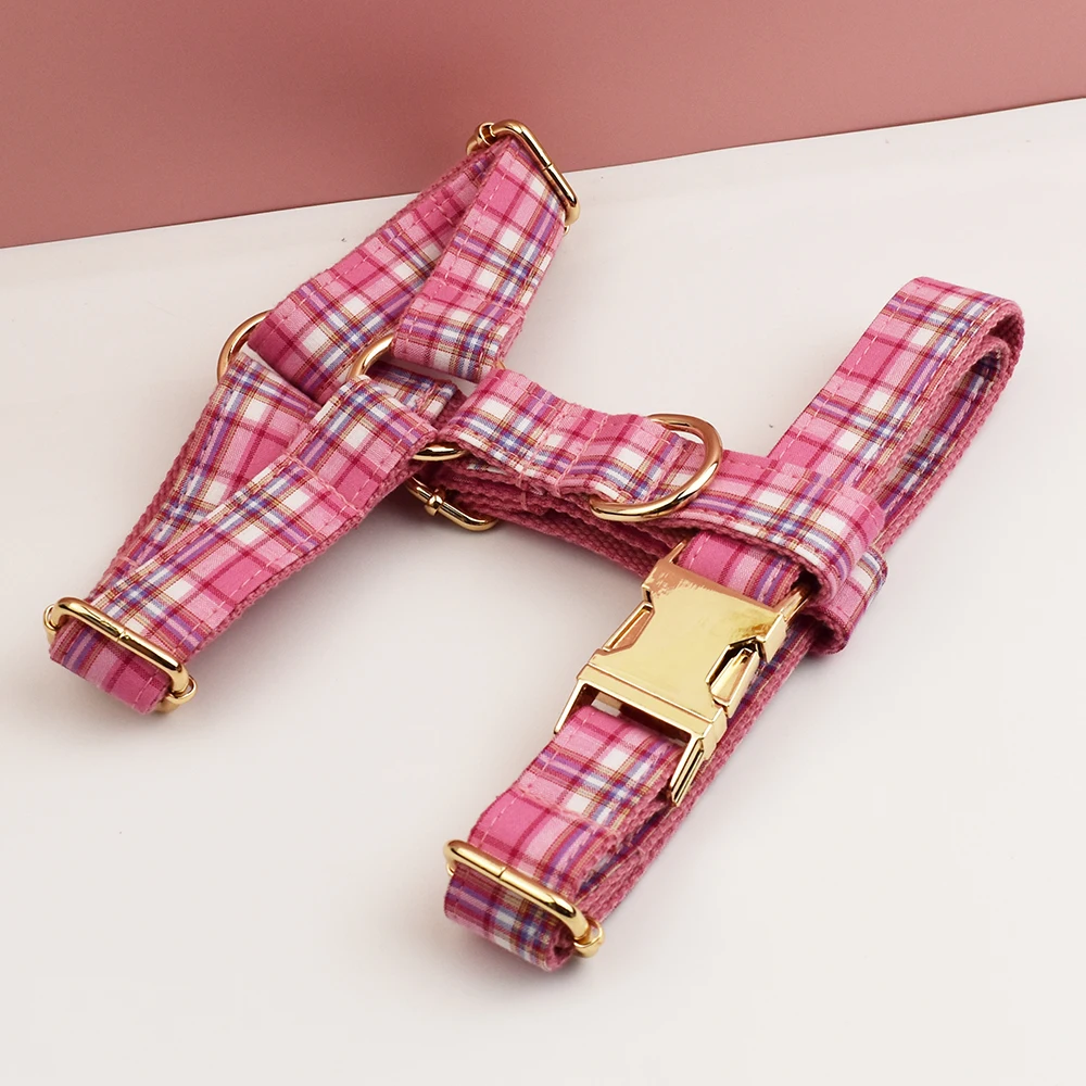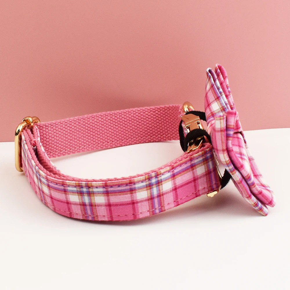 Juego de arnés y correa para perro a cuadros rosa y rosa con placa de identificación grabada personalizada, suministros personalizados para mascotas para perros