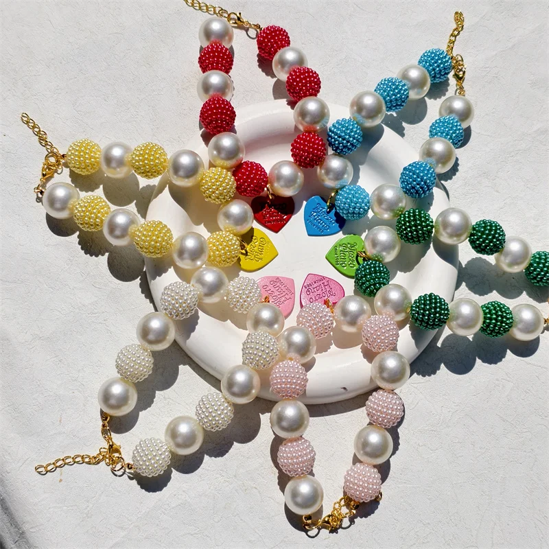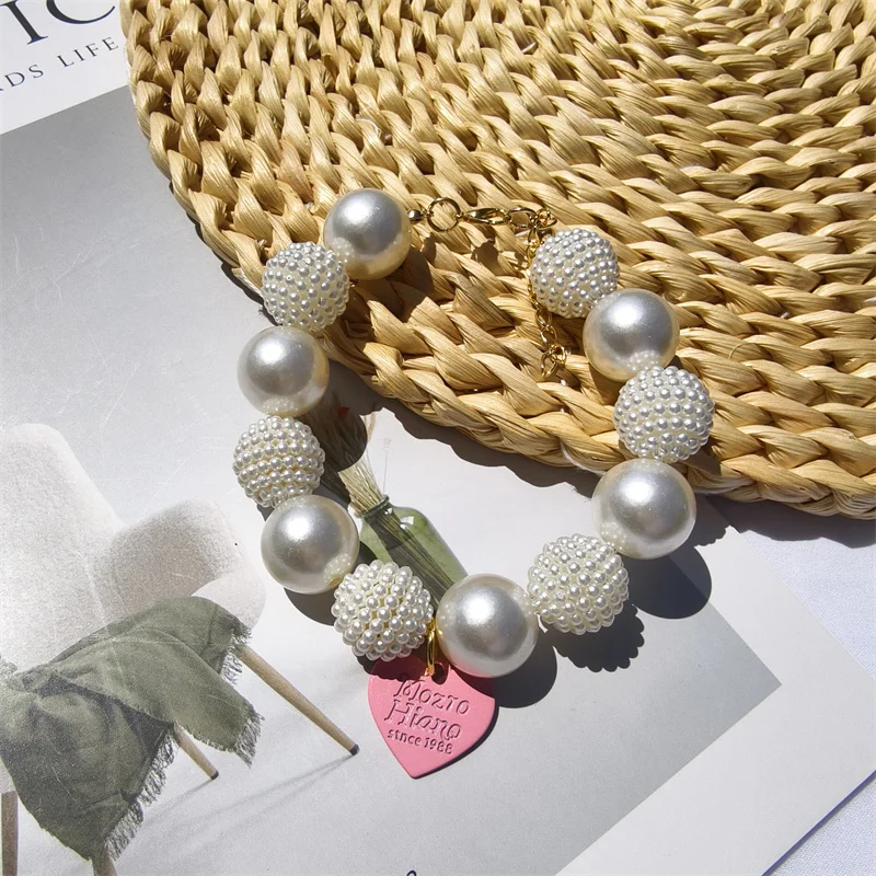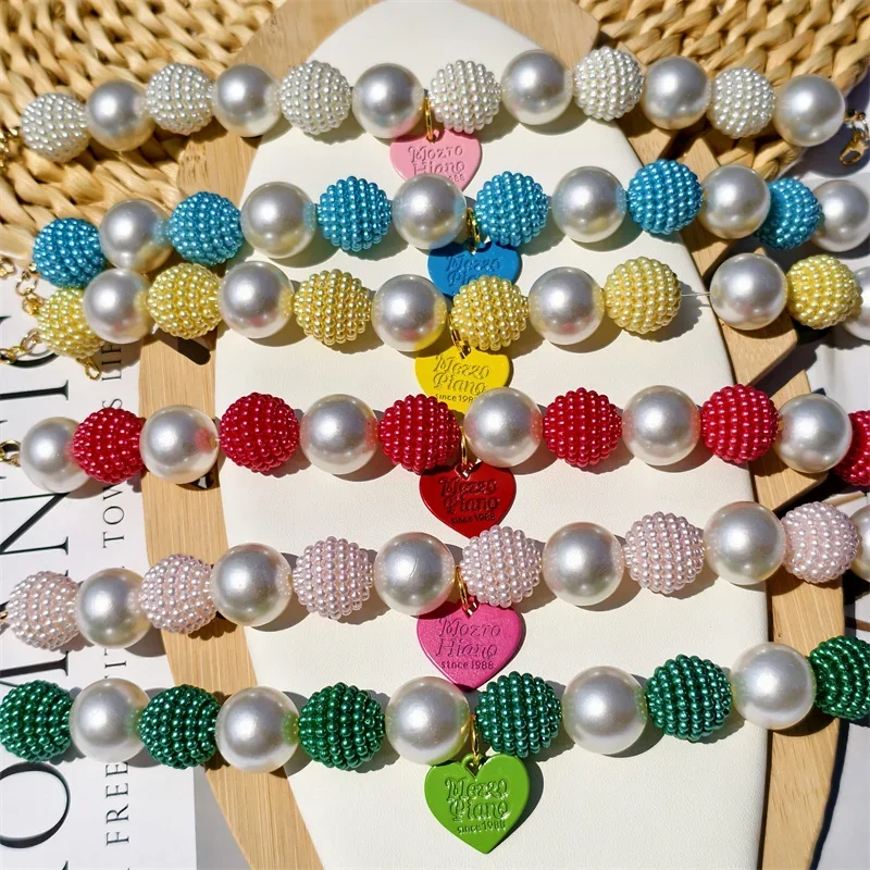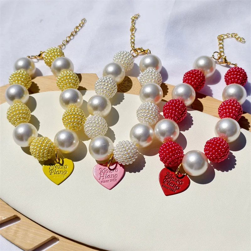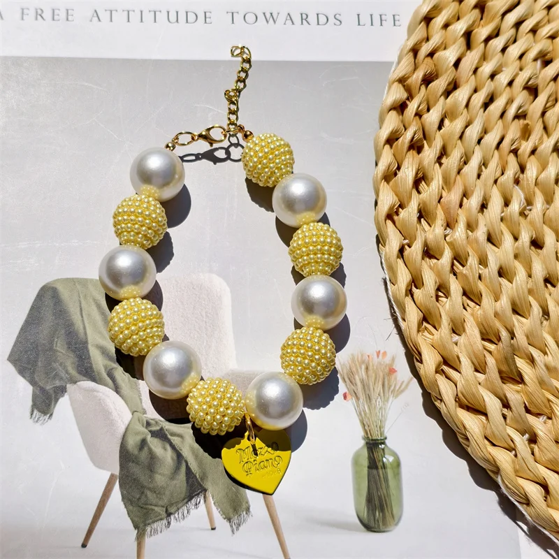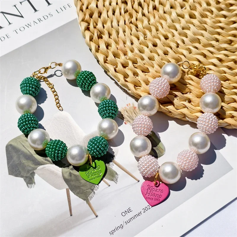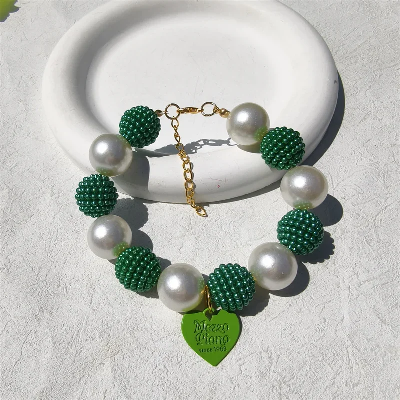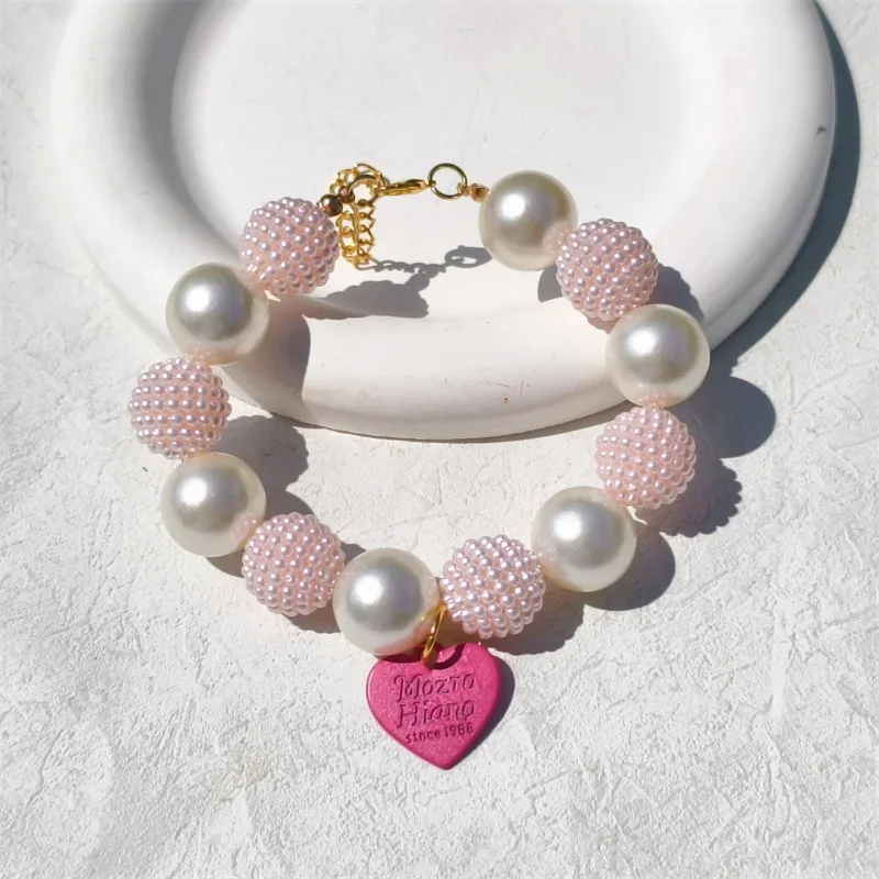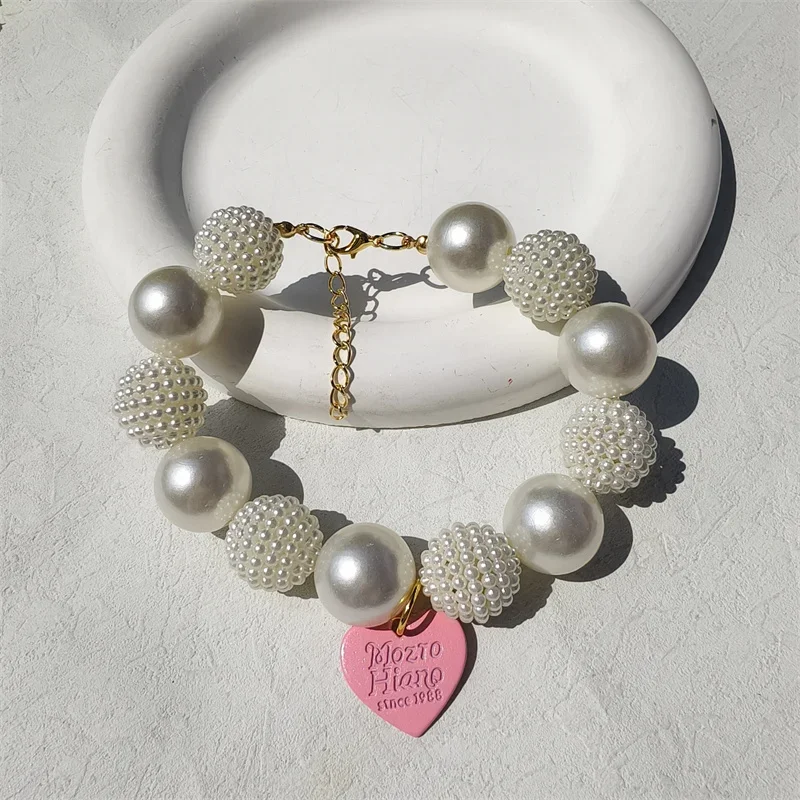Este collar cuenta con un diseño lujoso con un gran collar de perlas y un colgante de corazón de melocotón, perfecto para ocasiones especiales como fiestas de cumpleaños de mascotas.