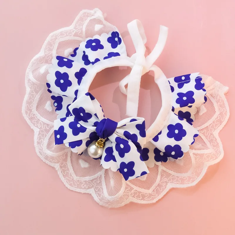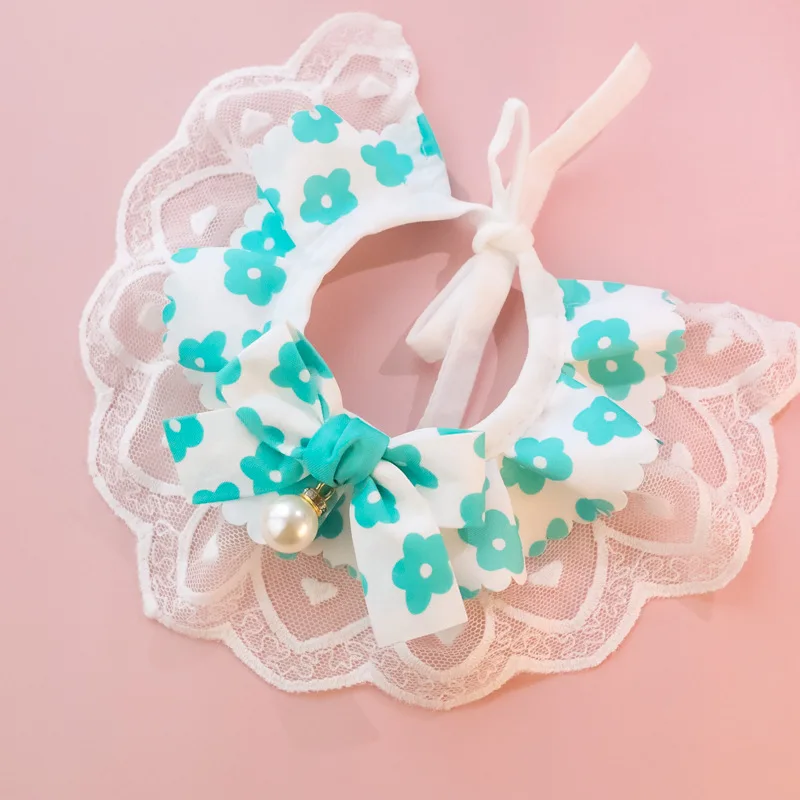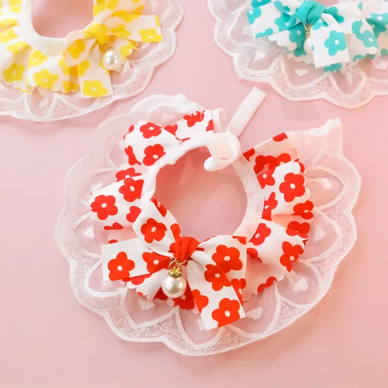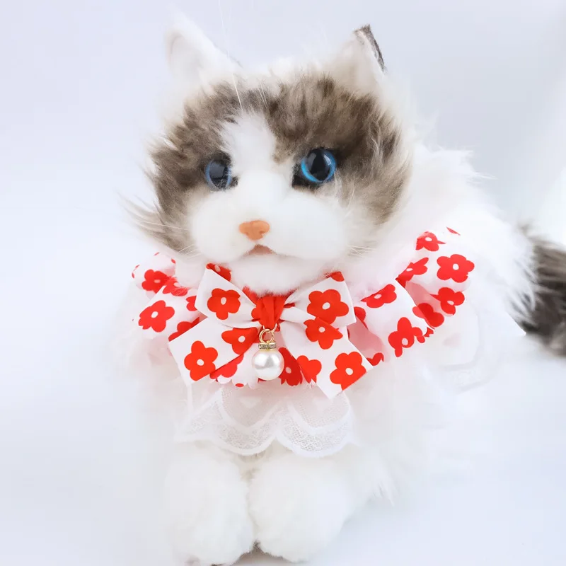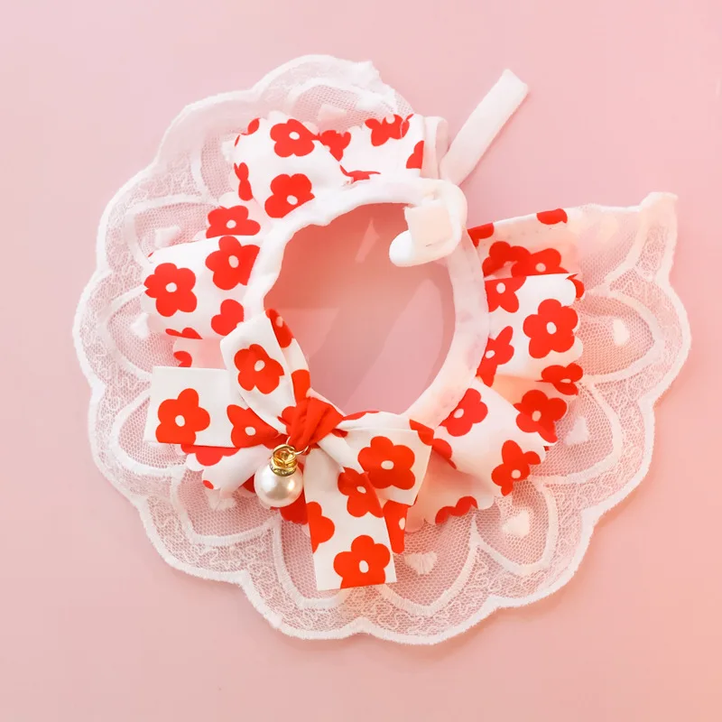 Este collar para mascotas presenta un colgante de perlas grandes de estilo coreano y una bufanda con lazo de flores de encaje, lo que agrega un toque de elegancia al look de su mascota.