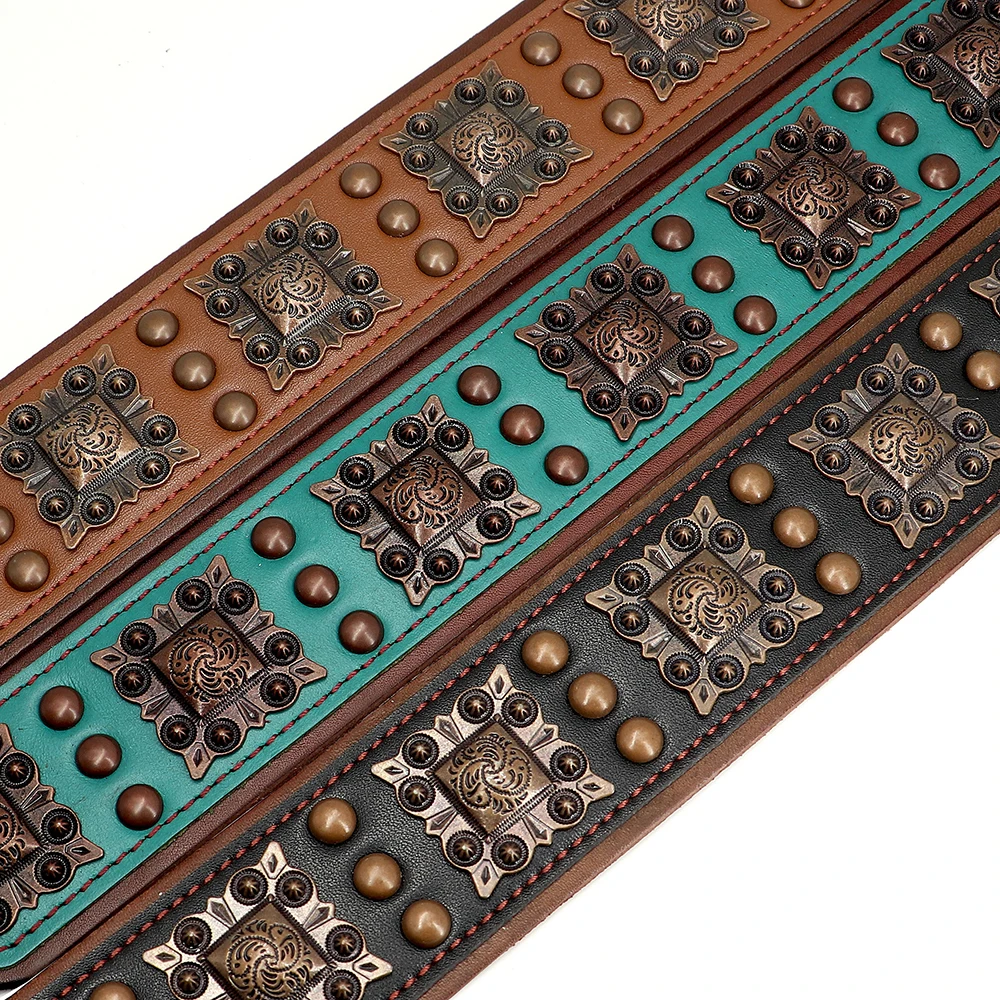 Encantado con el collar de cuero resistente con detalles de níquel y tornillos robustos en la parte posterior; los detalles no están pegados.