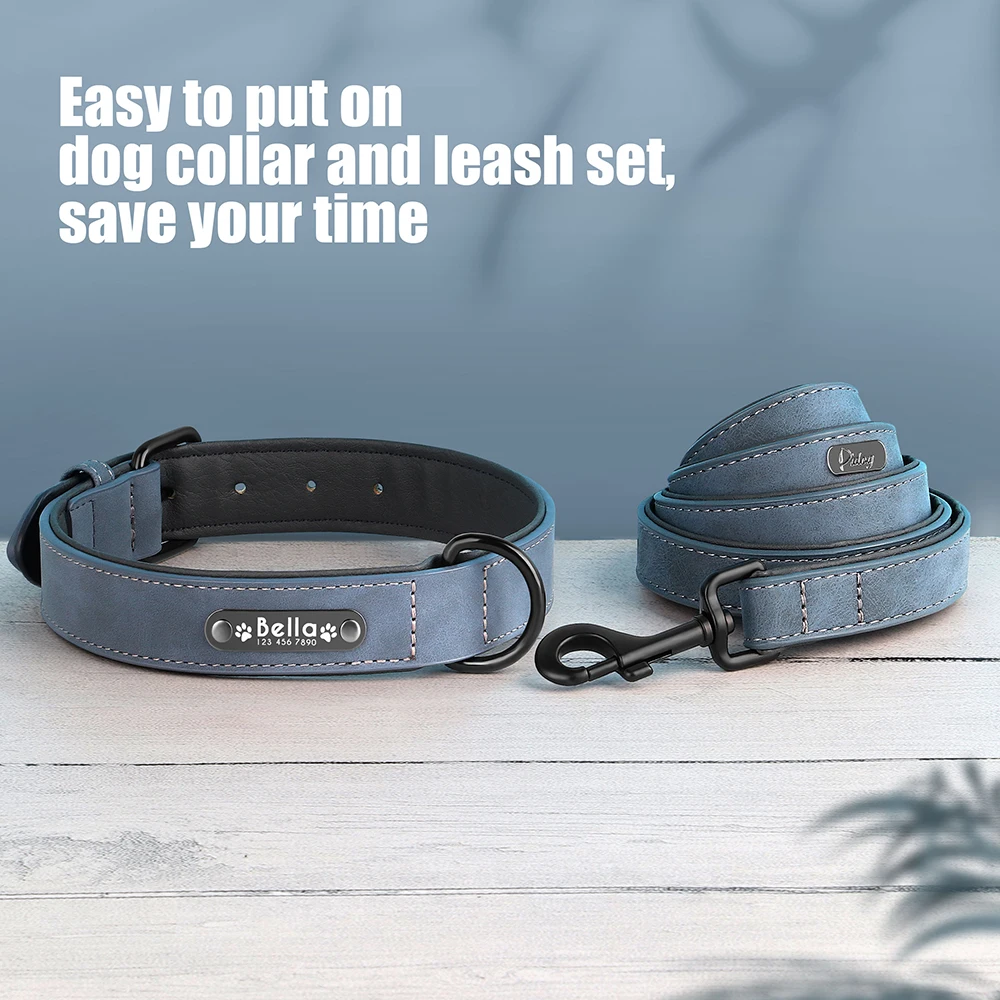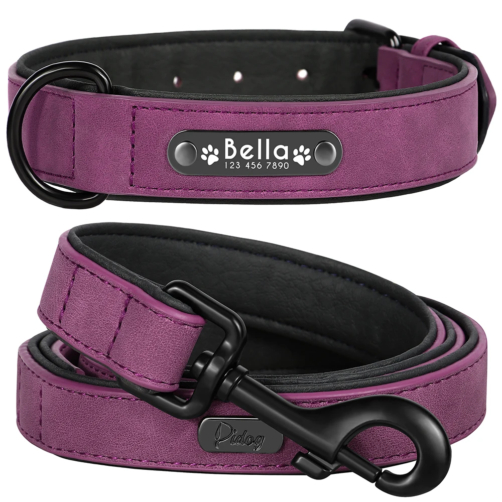 Juego de correa de collar de perro de cuero PU personalizado, collares de perro acolchados suaves grabados, collar de identificación de mascota con plomo para perros pequeños y grandes PugMaterial: cuero PU