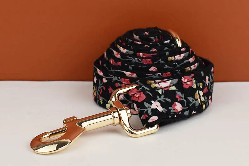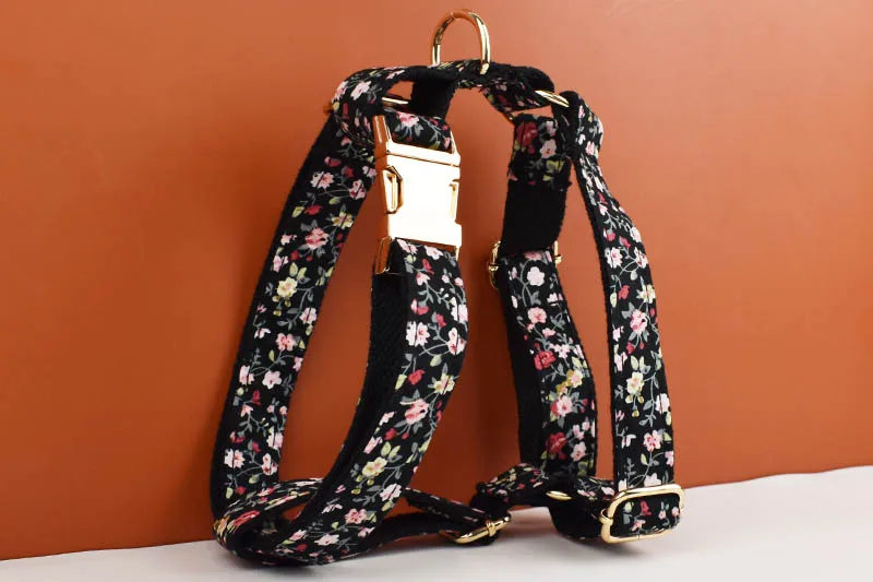 Accesorios de moda de lujo para mascotas Logotipo de diseño personalizado Flor de fondo negro sublimación collar de perro correas arnés arco conjunto Cotton04