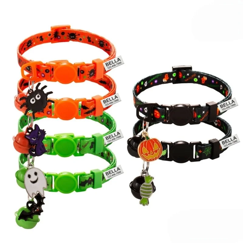 Collar personalizado para perro de Halloween, etiqueta con nombre, Collar ajustable de nailon para mascota, patrón de fantasma de murciélago monstruo de calabaza para fiesta, gato, perro, etiqueta de identificación