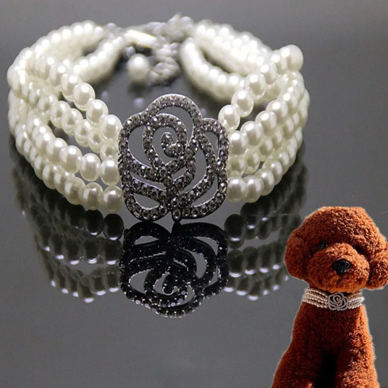 Collar de lujo para perros y gatos, collar de flores de diamantes de perlas de cuatro filas, cadena para perros pequeños, accesorios para mascotas de 20/25/30cm con diamantes de imitación