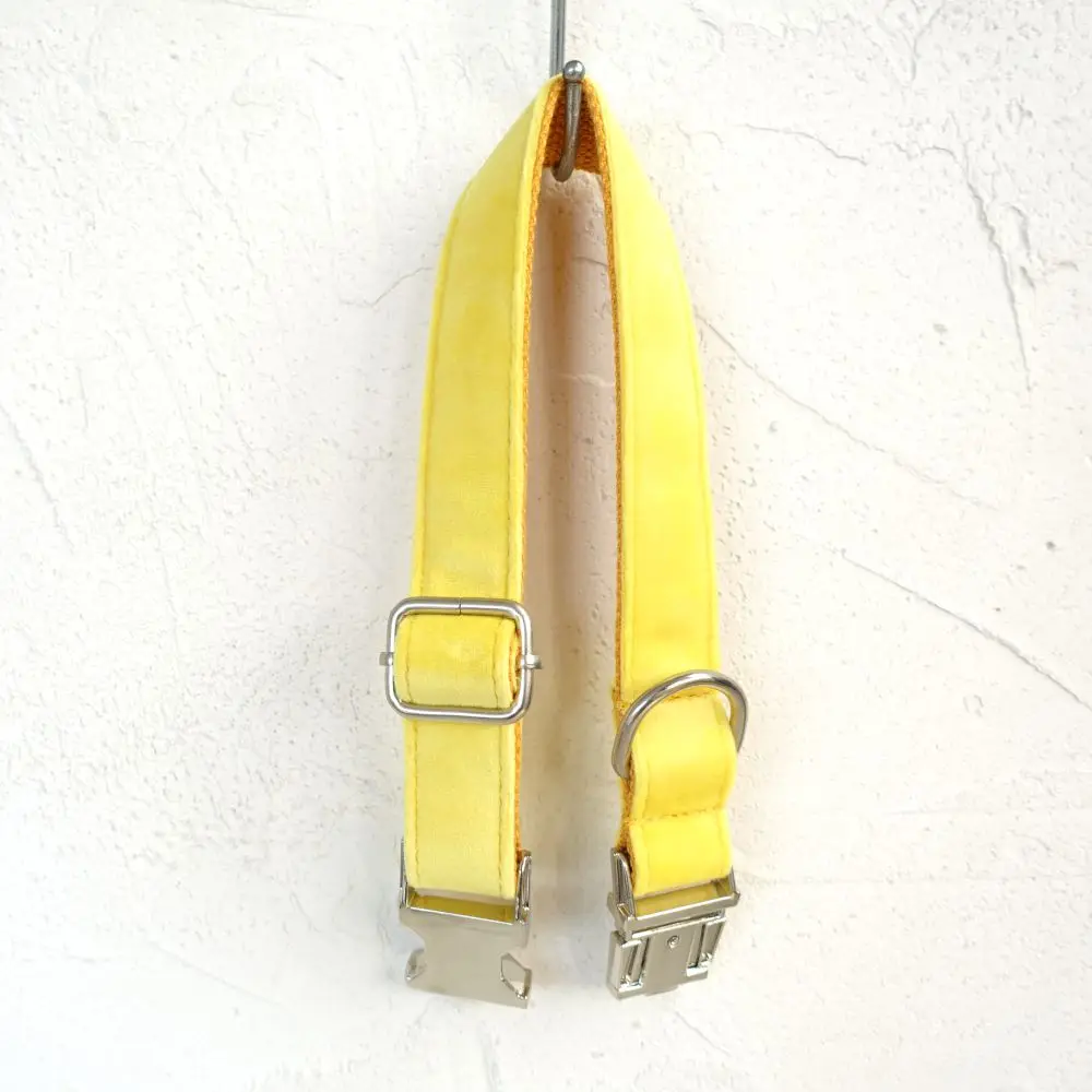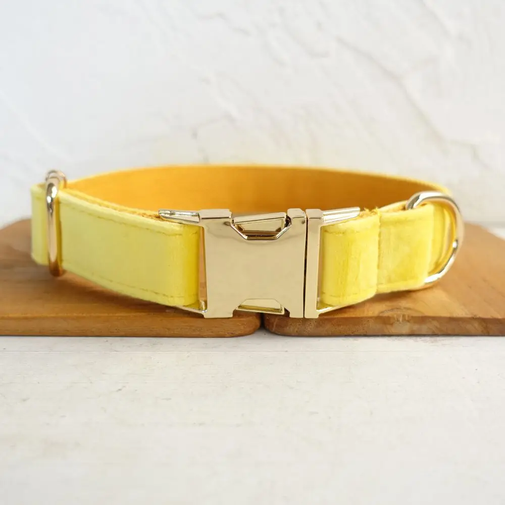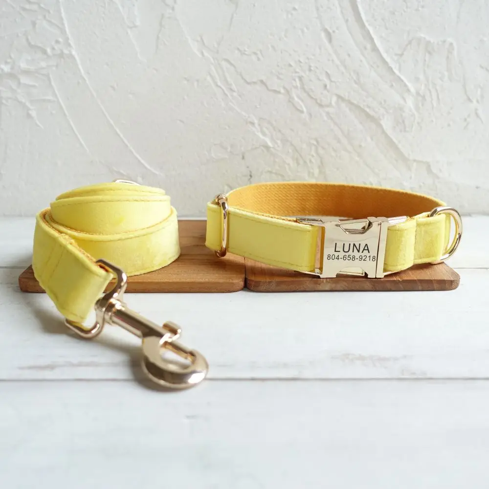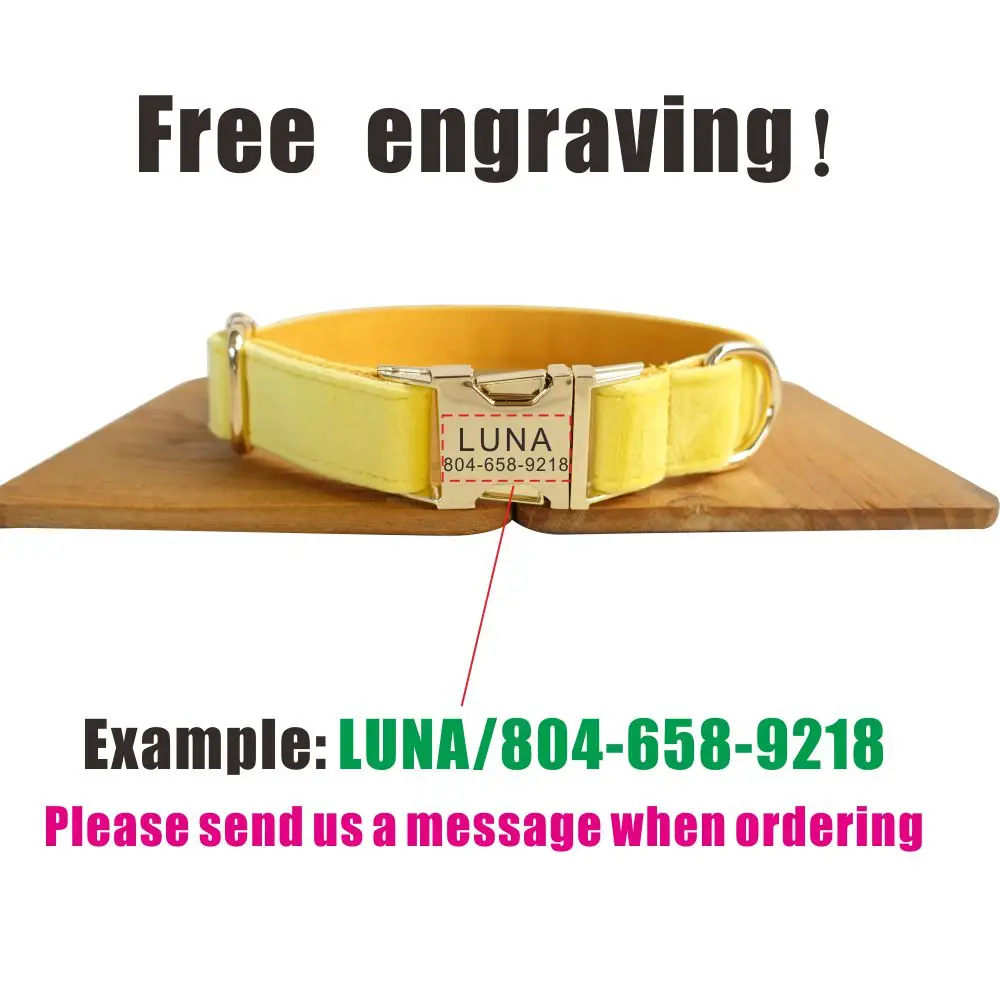 Nombre del producto: Collar personalizado para perros Collar personalizado para mascotas Grabado gratuito Etiqueta de nombre de identificación Accesorio para mascotas Collar de cachorro de terciopelo grueso amarillo Juego de correa
