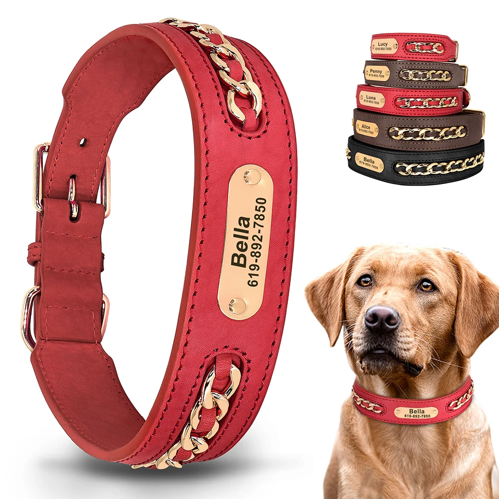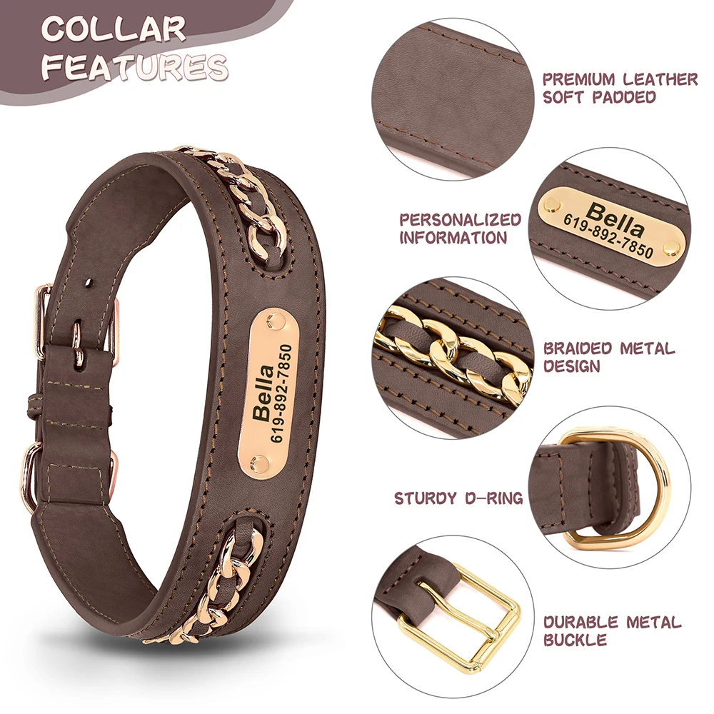 Collar personalizado para perros, collares de identificación de cuero duraderos con etiqueta de nombre antipérdida, accesorios de cadena para perros pequeños, medianos y grandes