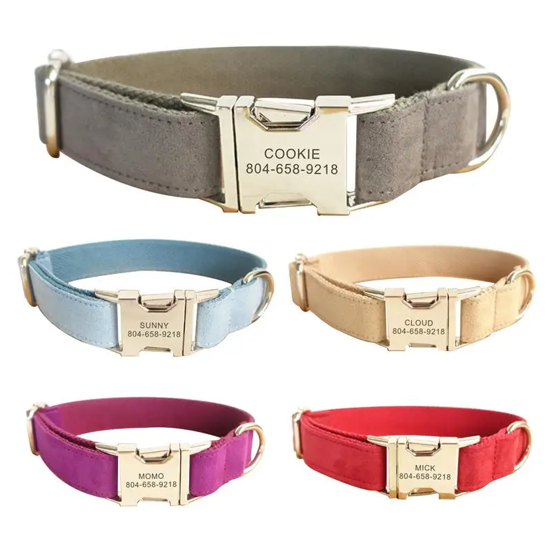 Nombre del producto: Collar personalizado para perros Collares personalizados para mascotas Etiqueta de placa con identificación de grabado gratuito Accesorio para mascotas Juego de correa de collar para cachorros de terciopelo múltiple