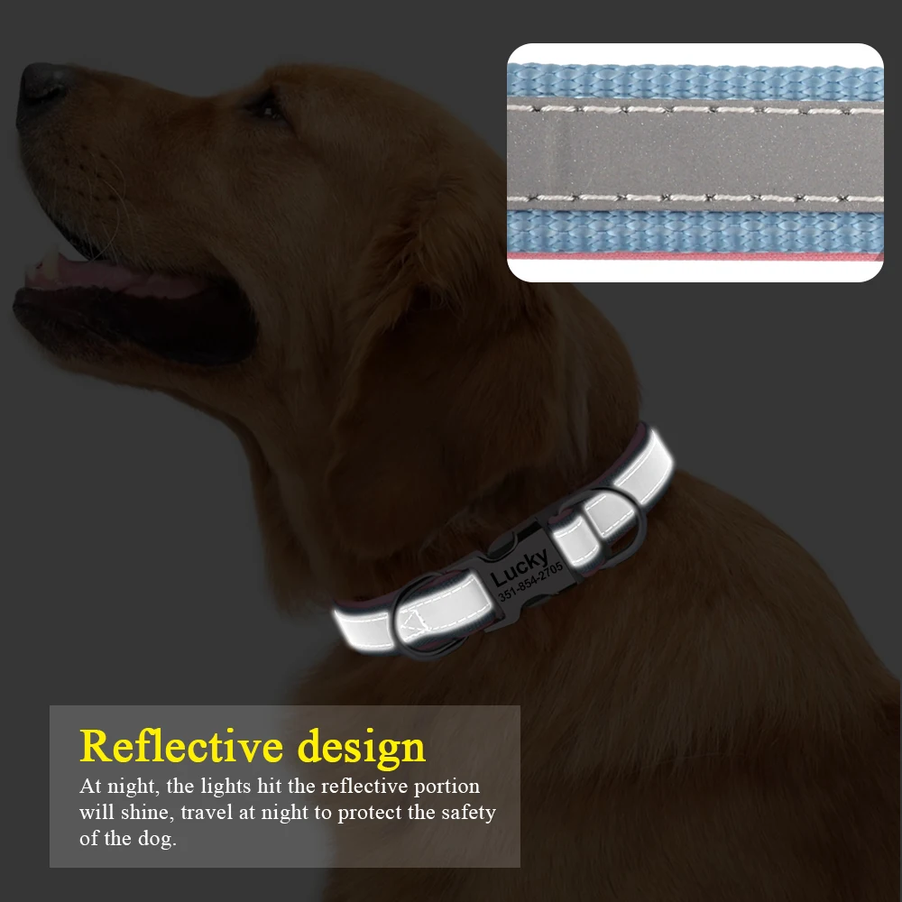Collar de perro personalizado, collares reflectantes de seguridad para perros, etiqueta de identificación grabada gratis, collares Pitbull Pug ajustables para perros pequeños y grandes
