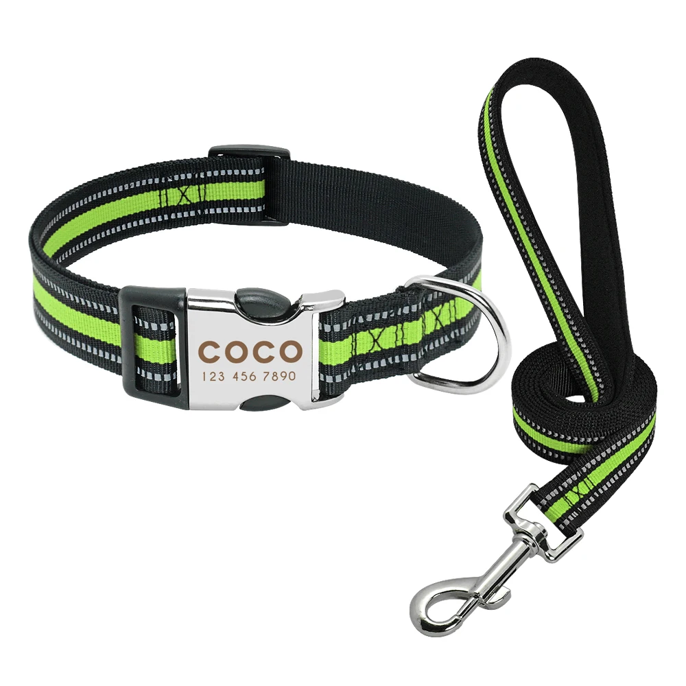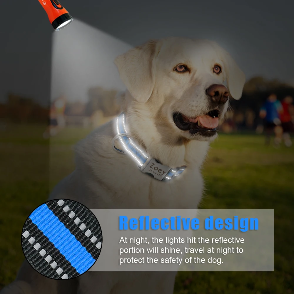 Tipo: Juego de correa de collar de perro personalizado Collar de etiqueta de perro de nailon personalizado Placa de identificación reflectante antipérdida Collares ajustables S-L