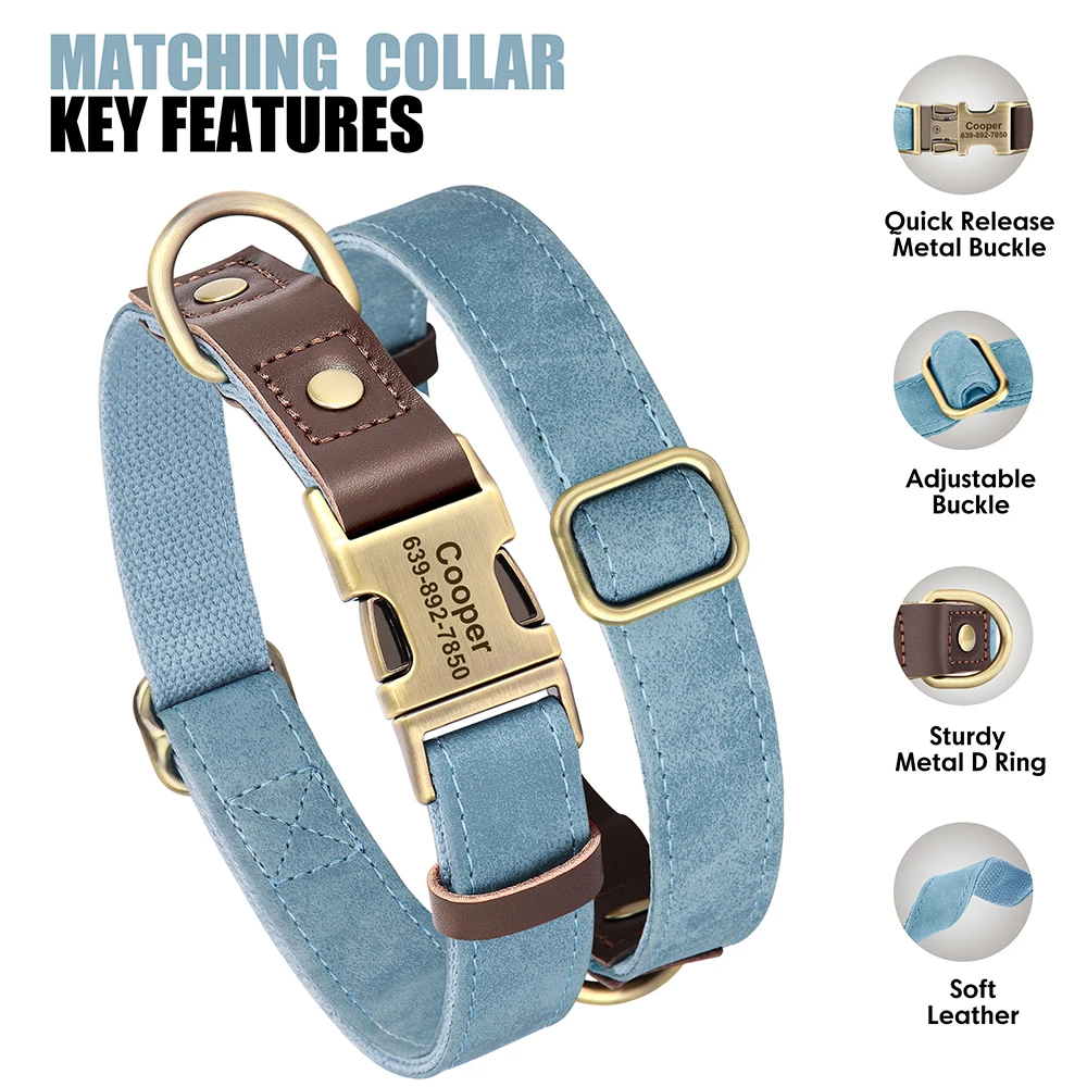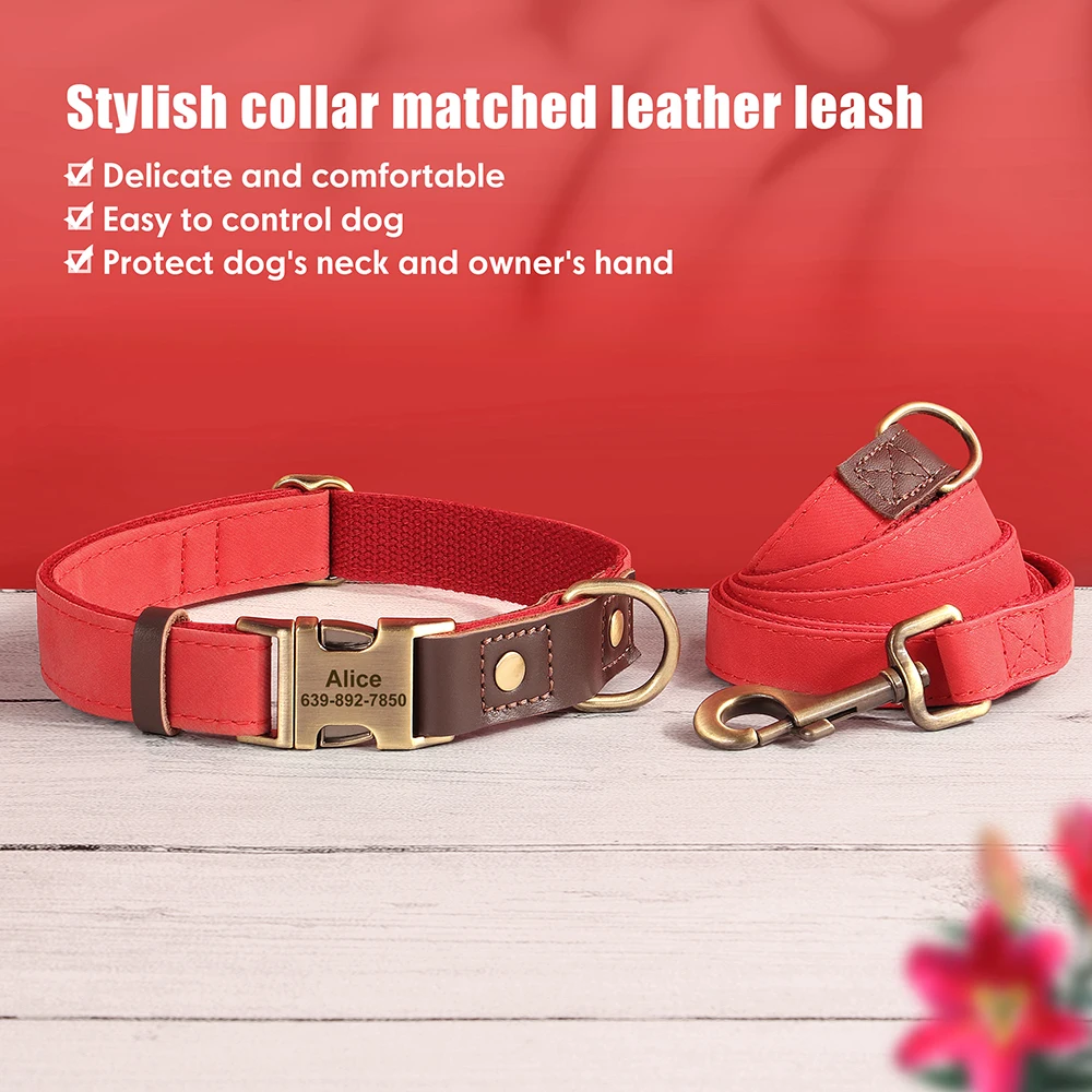 Correa personalizada para perro, collares de cuero PU para perro con cuerda de plomo para caminar, collar personalizado gratuito para identificación de mascota para perros pequeños y grandes PugMaterial: nailon + cuero PU