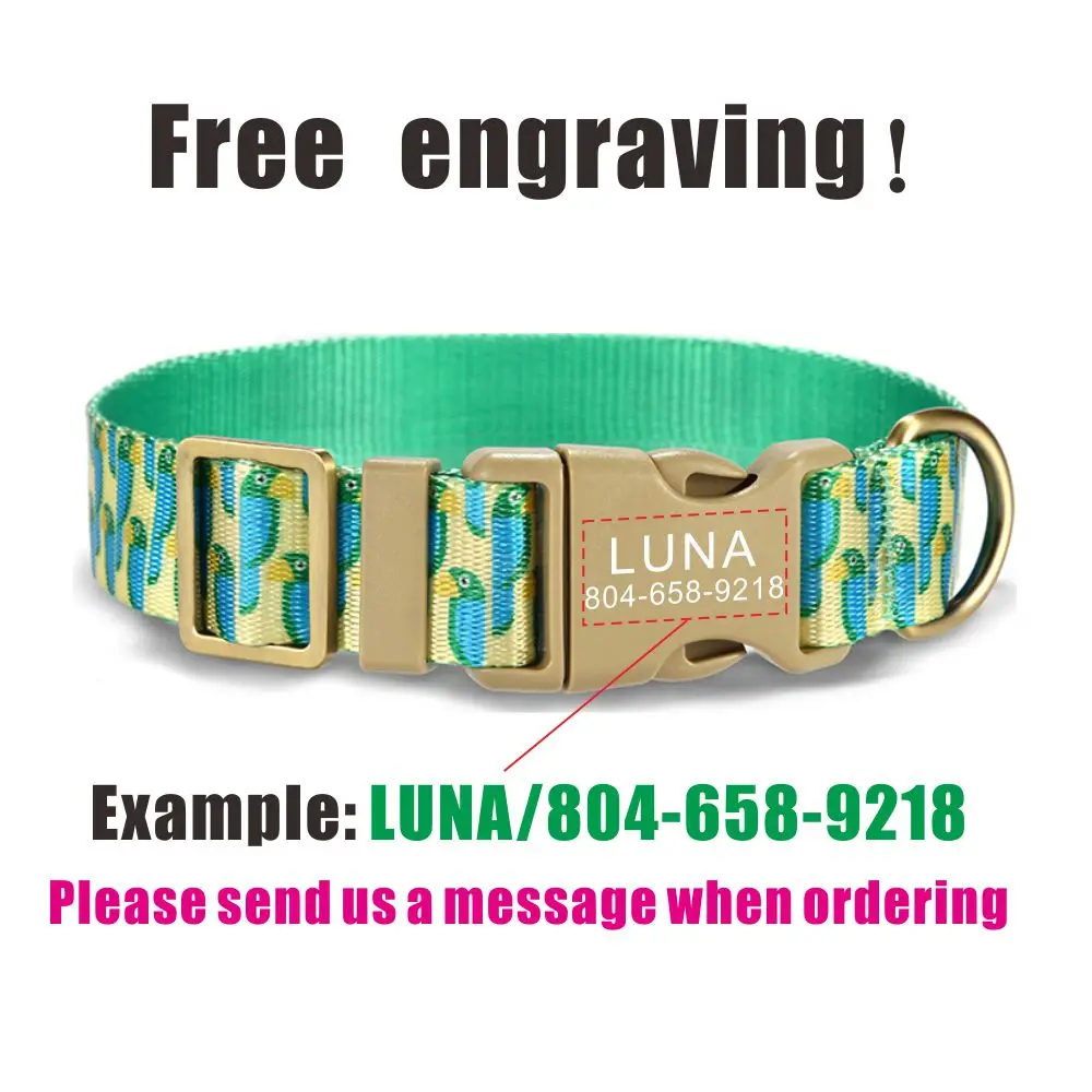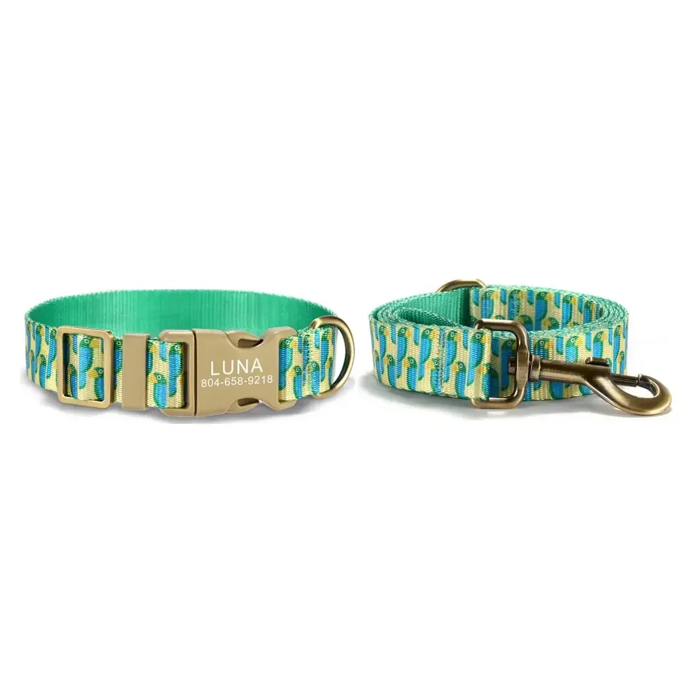 Nombre del producto: Collar personalizado para perros, correas a juego, nombre de identificación personalizado, contactos, hebilla, collares ajustables para mascotas de perro loro verde