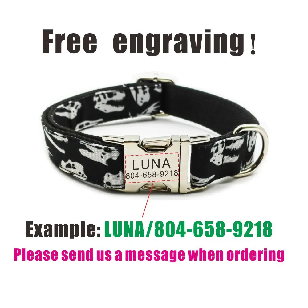 Collar de perro personalizado con grabado gratuito, correa para mascotas a juego, hebilla de Metal de contactos personalizados, Collar para mascotas con esqueleto negro