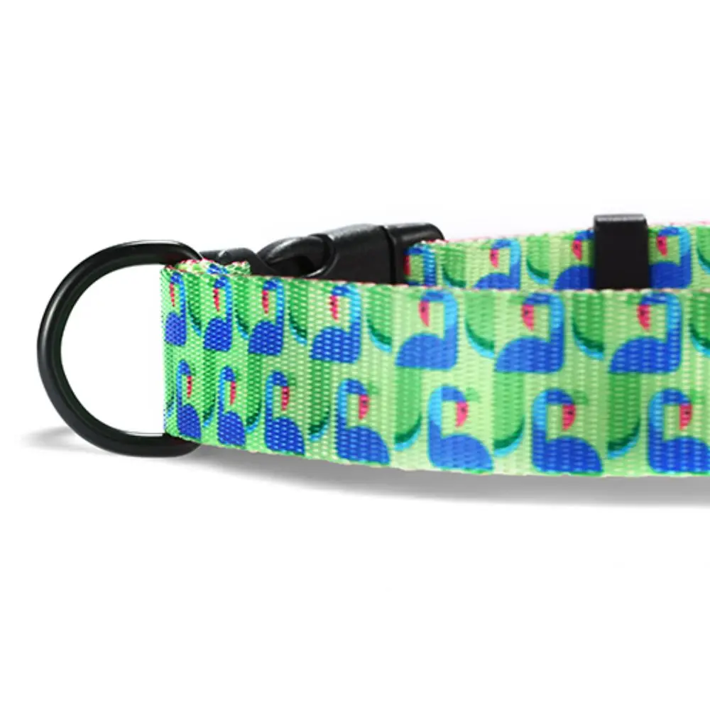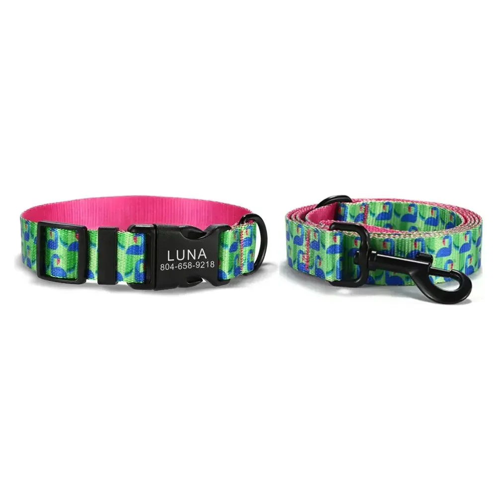 Nombre del producto: Collar personalizado para perros con grabado gratuito, correa para mascotas a juego, hebilla de contacto personalizada, Collar para mascotas con flamencos verdes