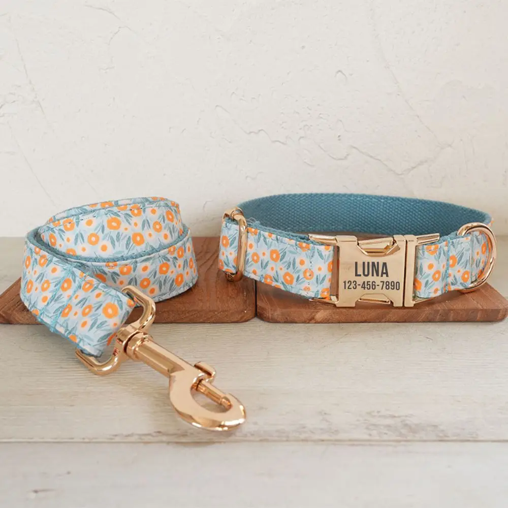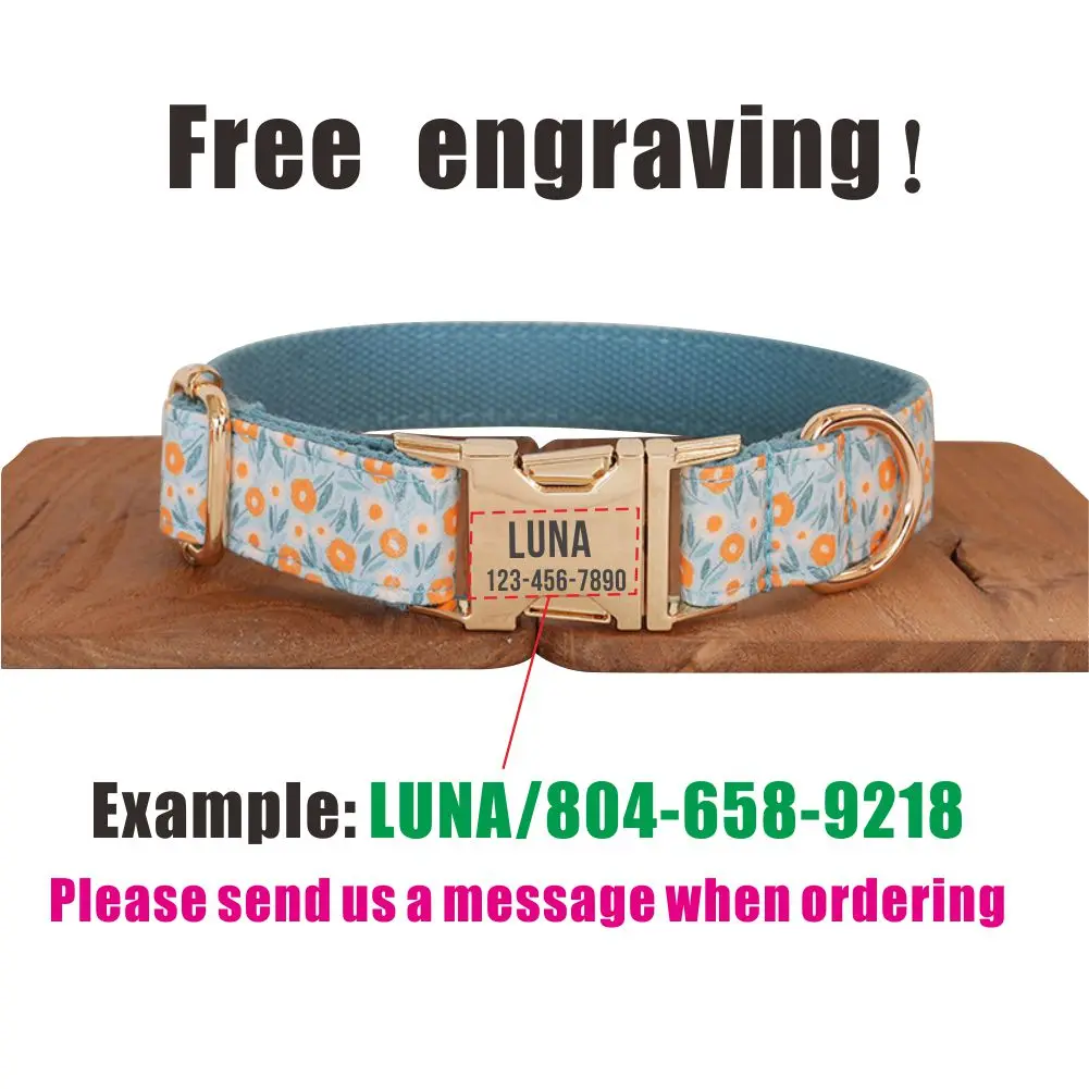 Nombre del producto: Collar para perro personalizado con grabado gratuito, Correa para mascotas a juego, Hebilla de metal con contactos personalizados, Collar de girasol azul