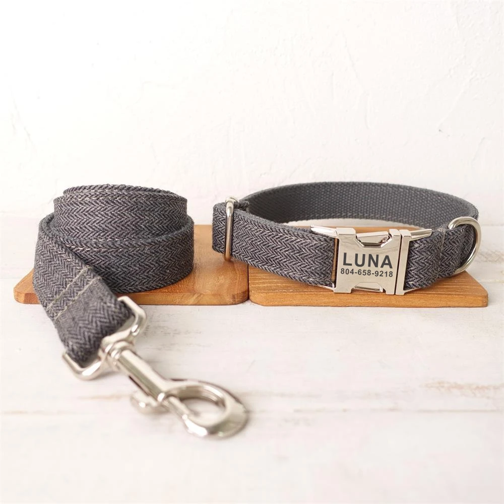 Product Name: Personalized Dog Collar Custom Pet Collar Free Engraving ID Name Tag Pet Accessory Grey Thick Suit Fiber Puppy Collar Leash Set
