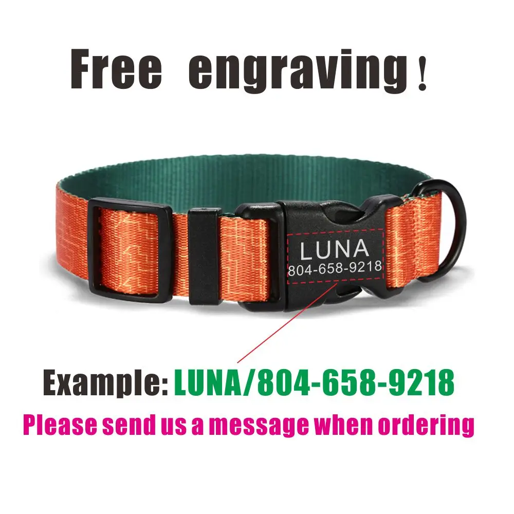 Please leave us a message when you order.For example: COOKIE/804-658-9218*Material: Placstic buckle+Metal clips+Fiber*Size:XS/S/M/L/XL (please check the below picture)*Feature: FREE Personalized engraving,No need extra ID tag for your dog, avoid losing it.